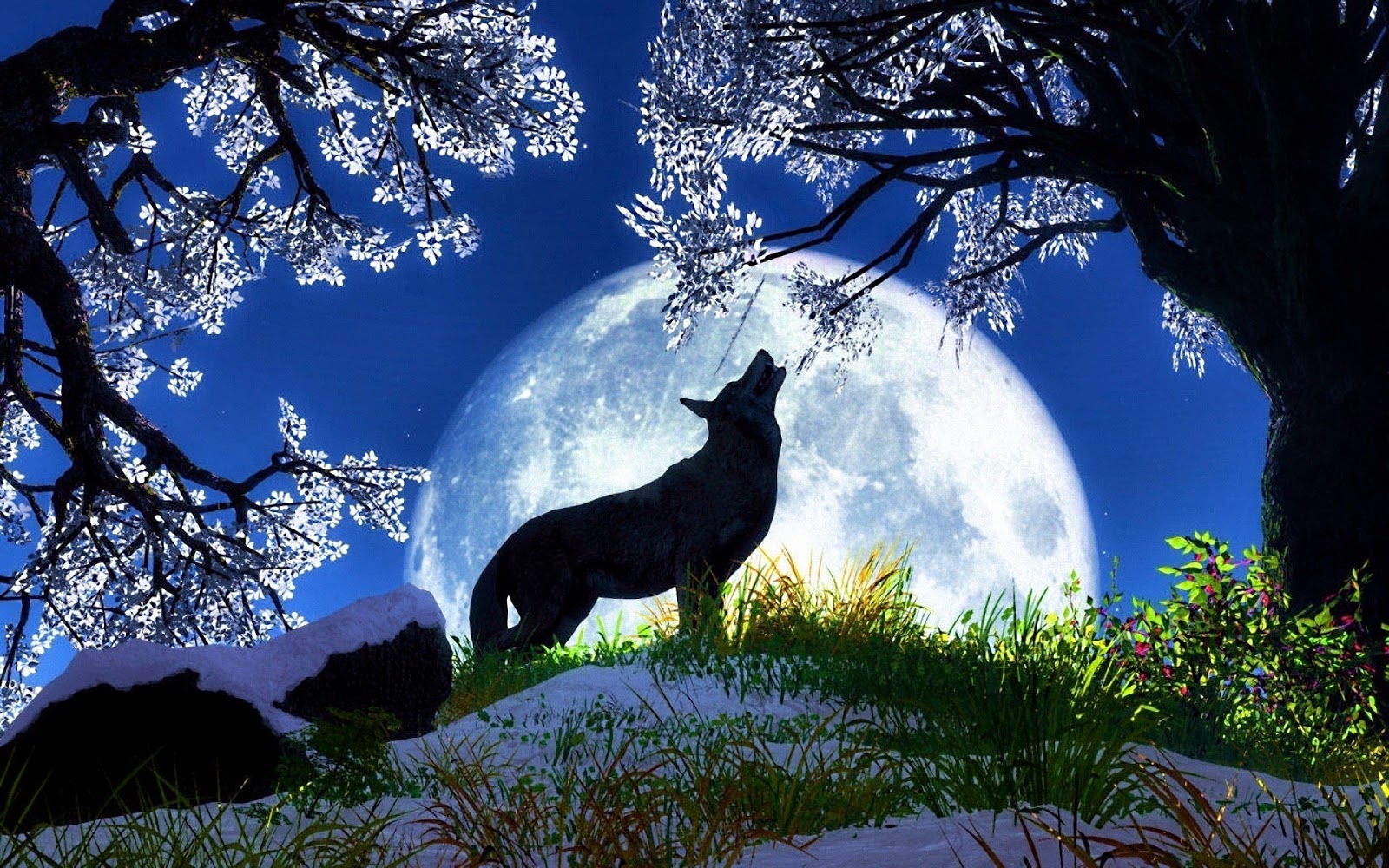 Description: A wolf standing on a hill with a full moon in the background and trees in the foreground.