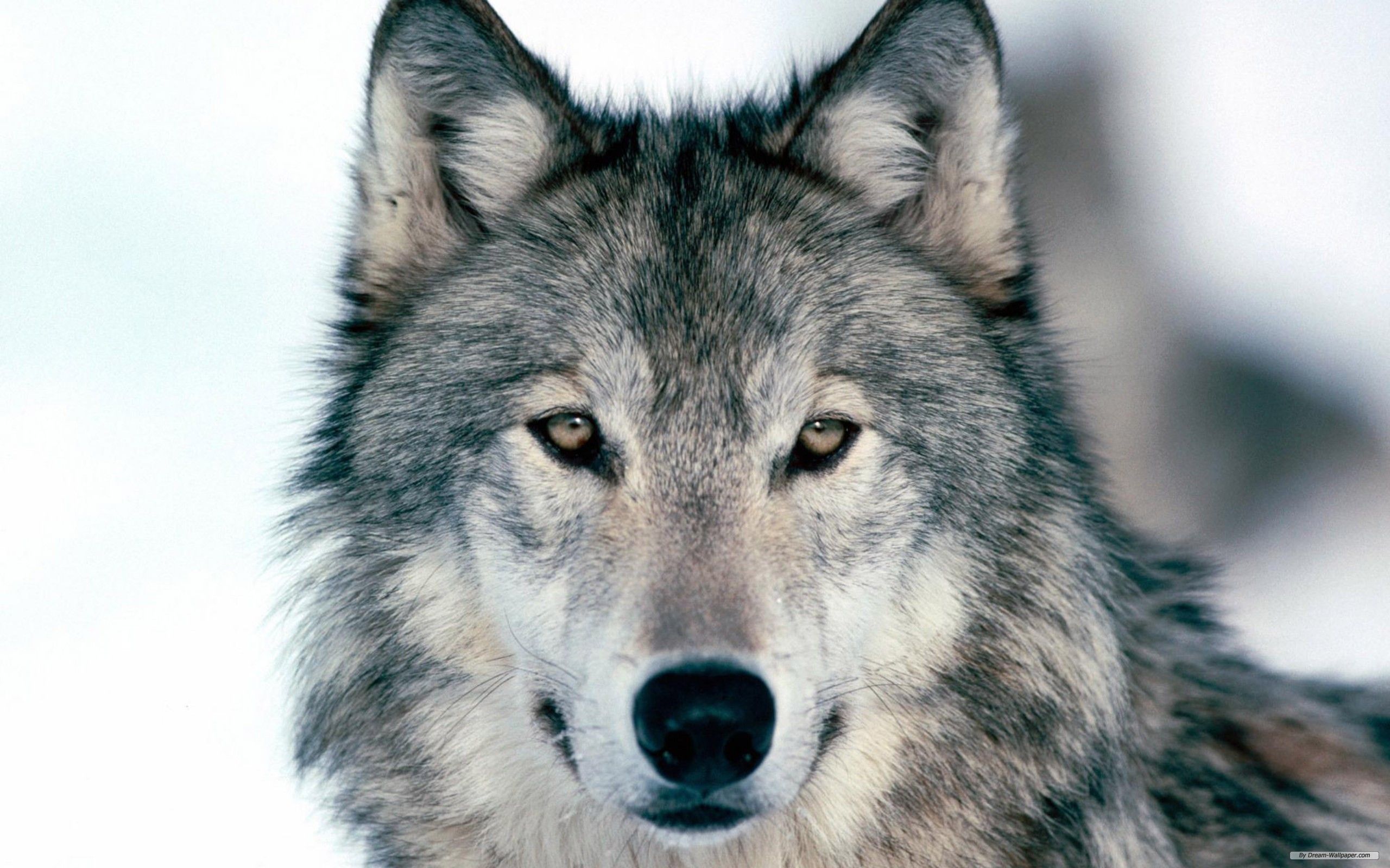 Description: A wolf is looking at the camera in the snow with a blurry background of snow and snow flakes.