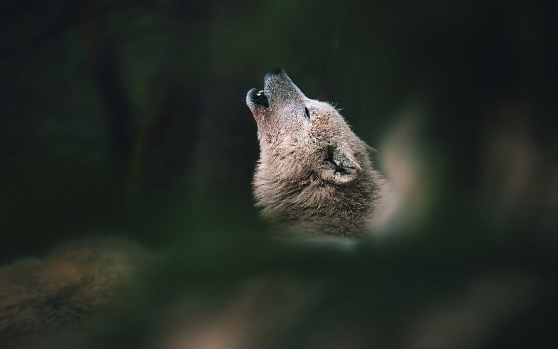 Description: A wolf is looking up at the sky with its eyes closed and mouth open.