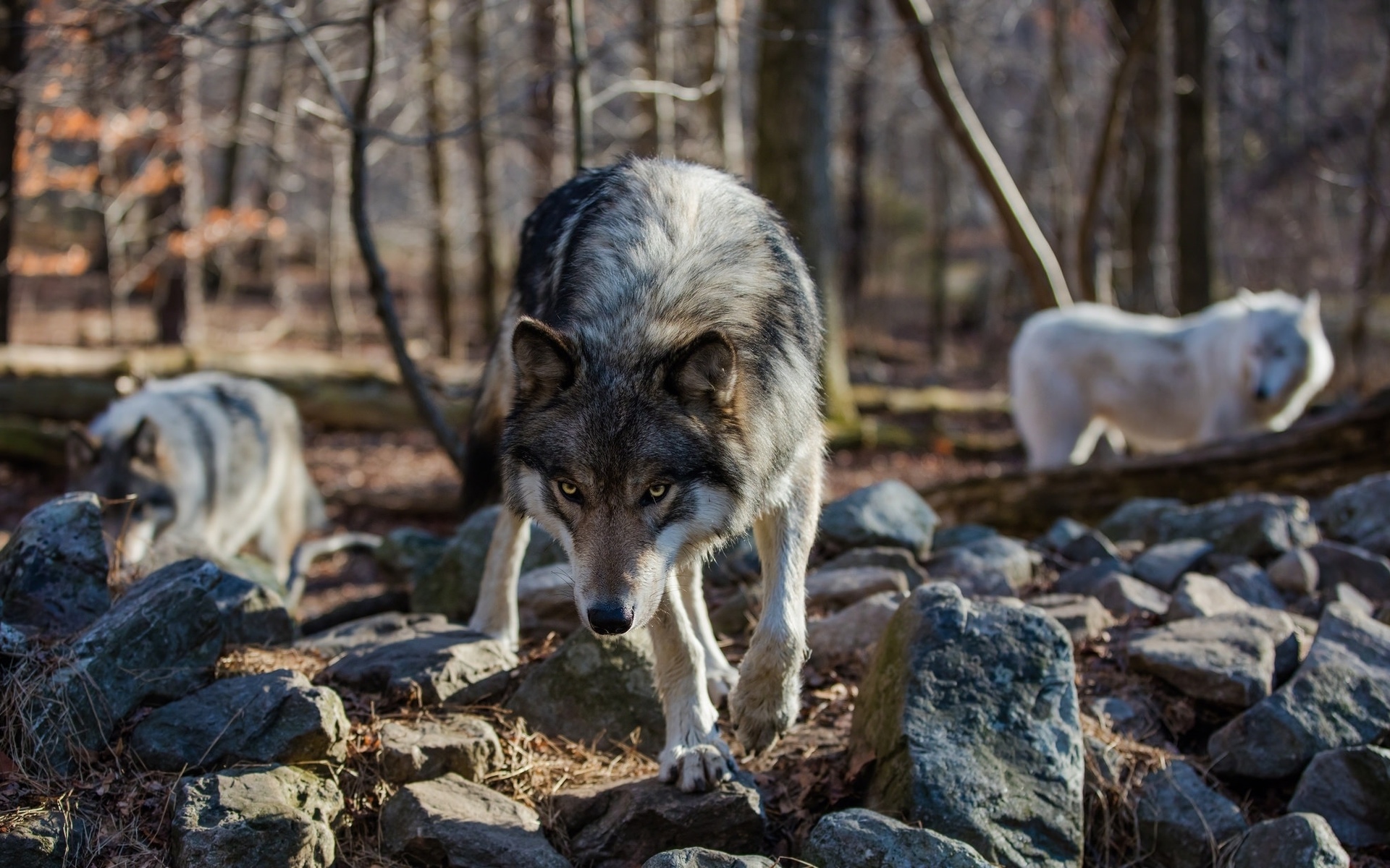 Description: A wolf walking on rocks in a forest with other animals in the background and a fallen tree in the foreground.