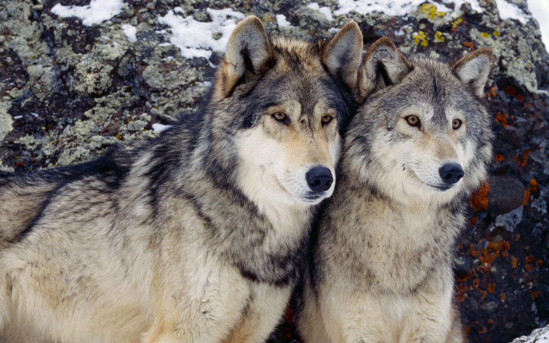 Description: Two wolfs are standing next to each other on a rocky surface with snow on the ground and rocks.