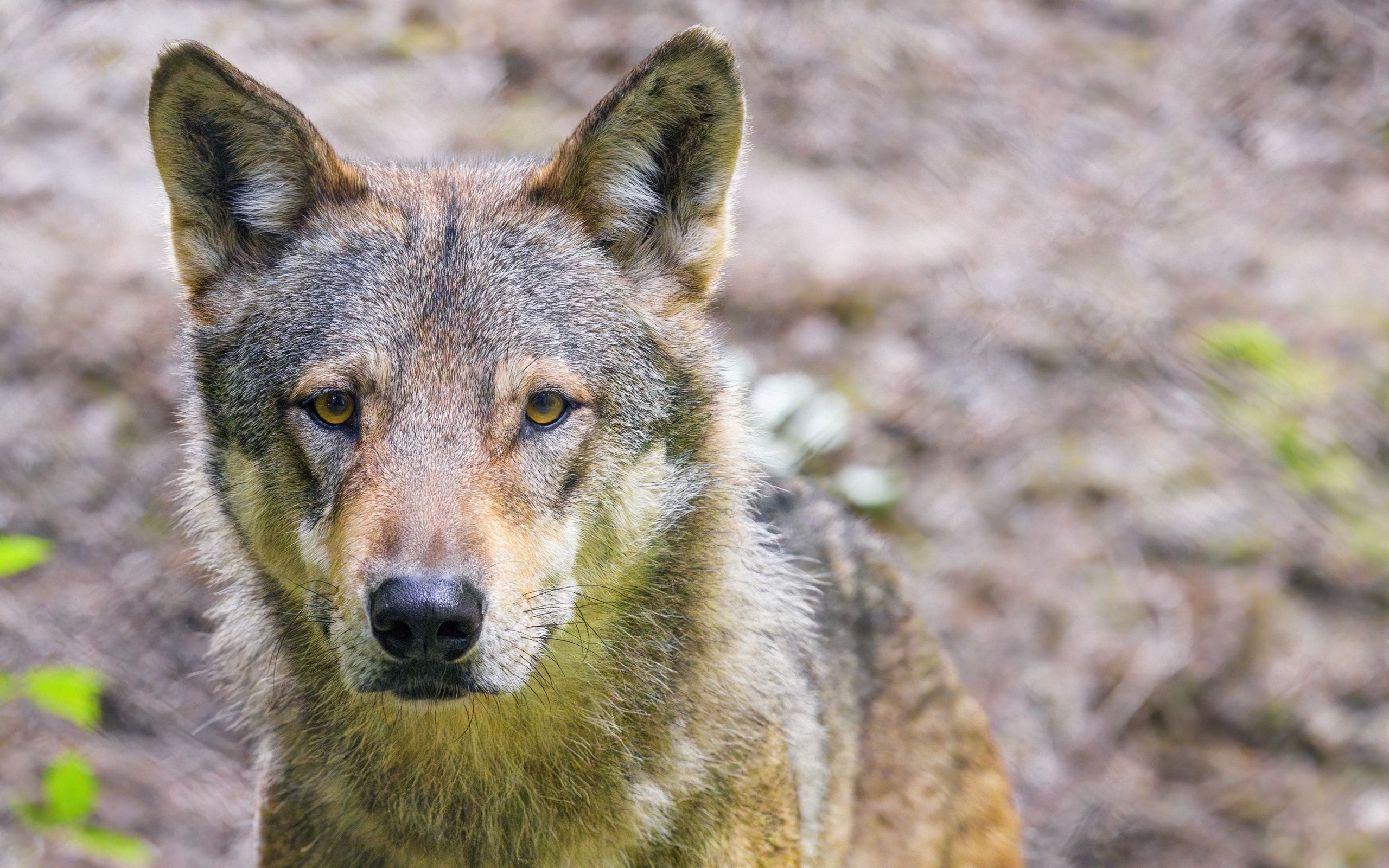 Description: A wolf looking at the camera with a blurry background of grass and bushes in the background.