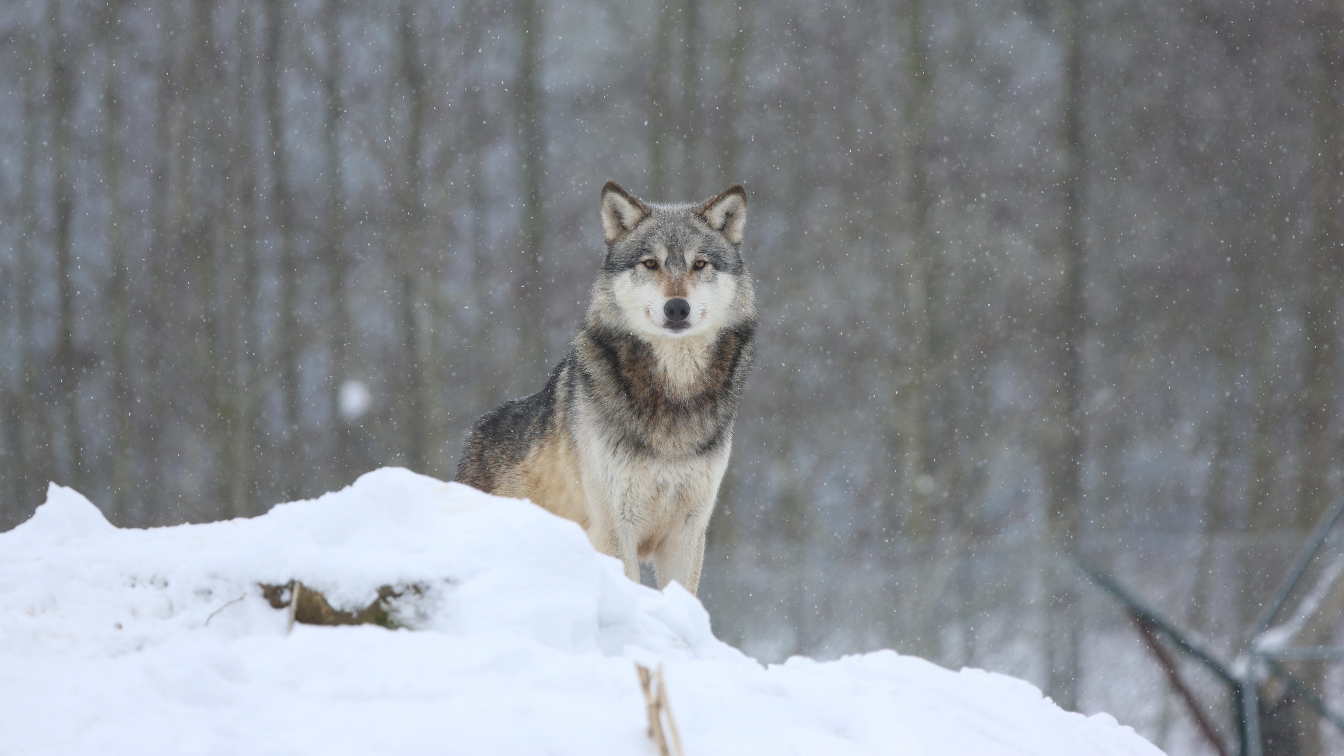 Description: A wolf standing on top of a snow covered hill in the woods with trees in the background and snow falling on the ground.