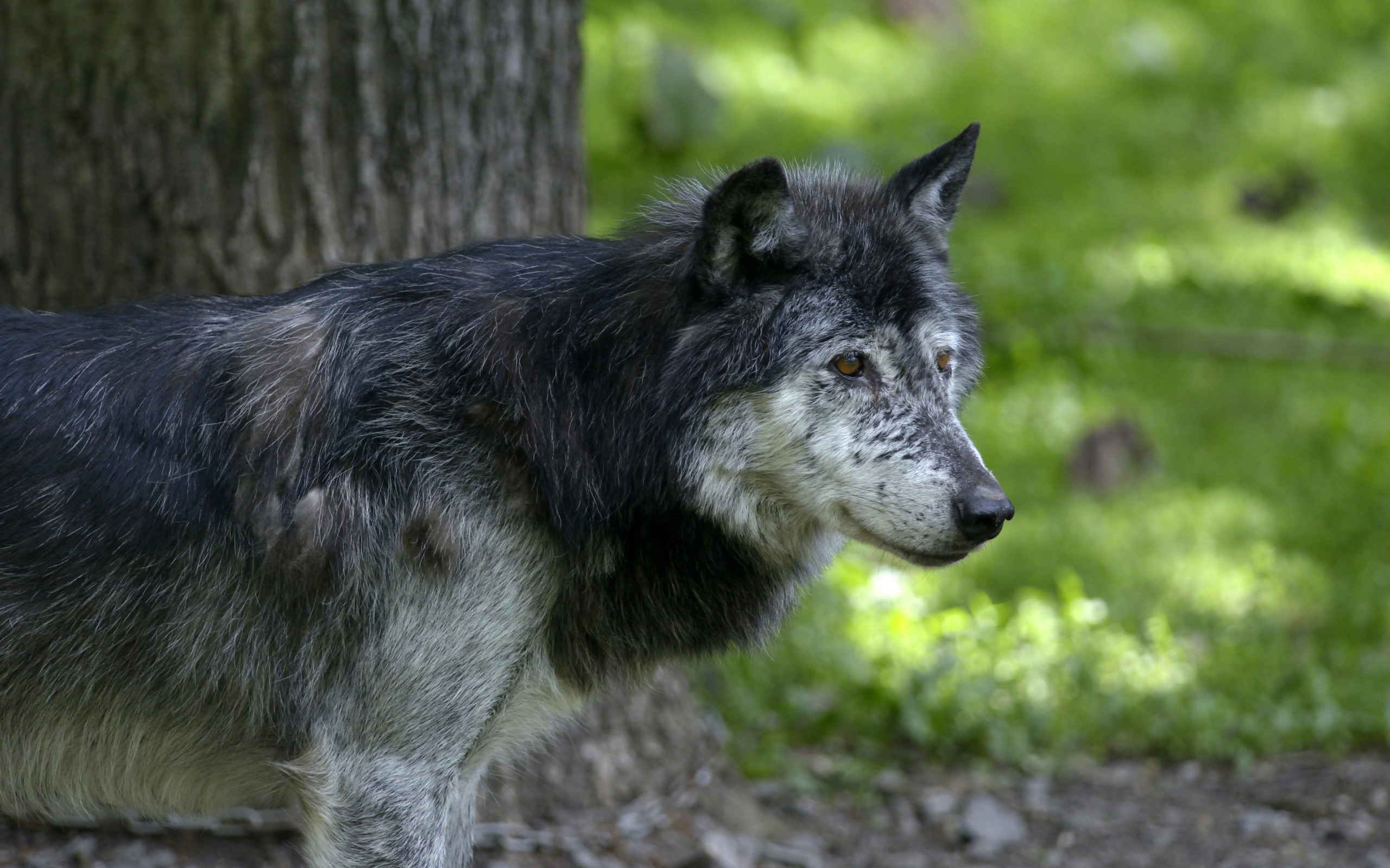 Description: A wolf standing next to a tree in a forest with grass and trees in the background and a blurry background.