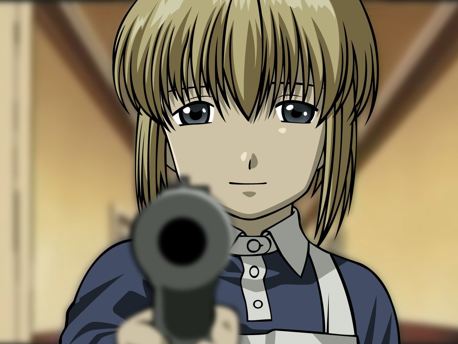 Description: A woman holding a gun in her hand and pointing it at the camera with a serious look on her face.