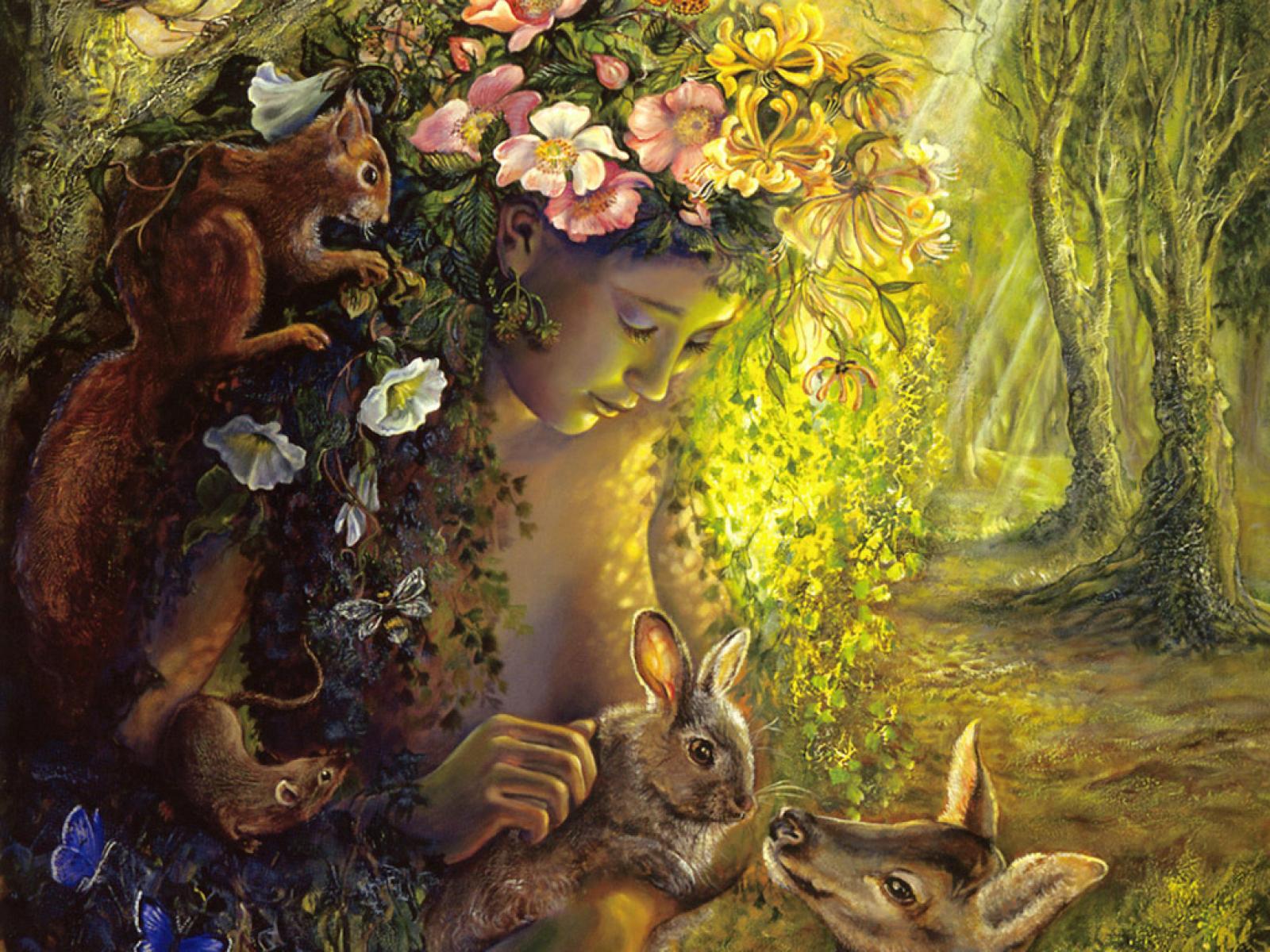 Description: A painting of a woman surrounded by animals in a forest with flowers in her hair and a bird on her shoulder.