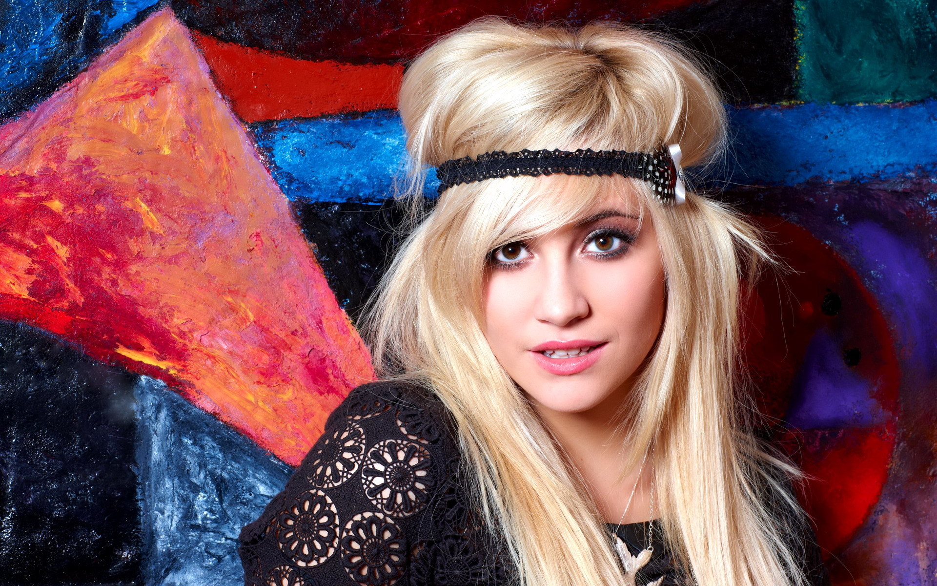 Description: A woman with a head band on her head posing for a picture in front of a colorful background with a diamond.