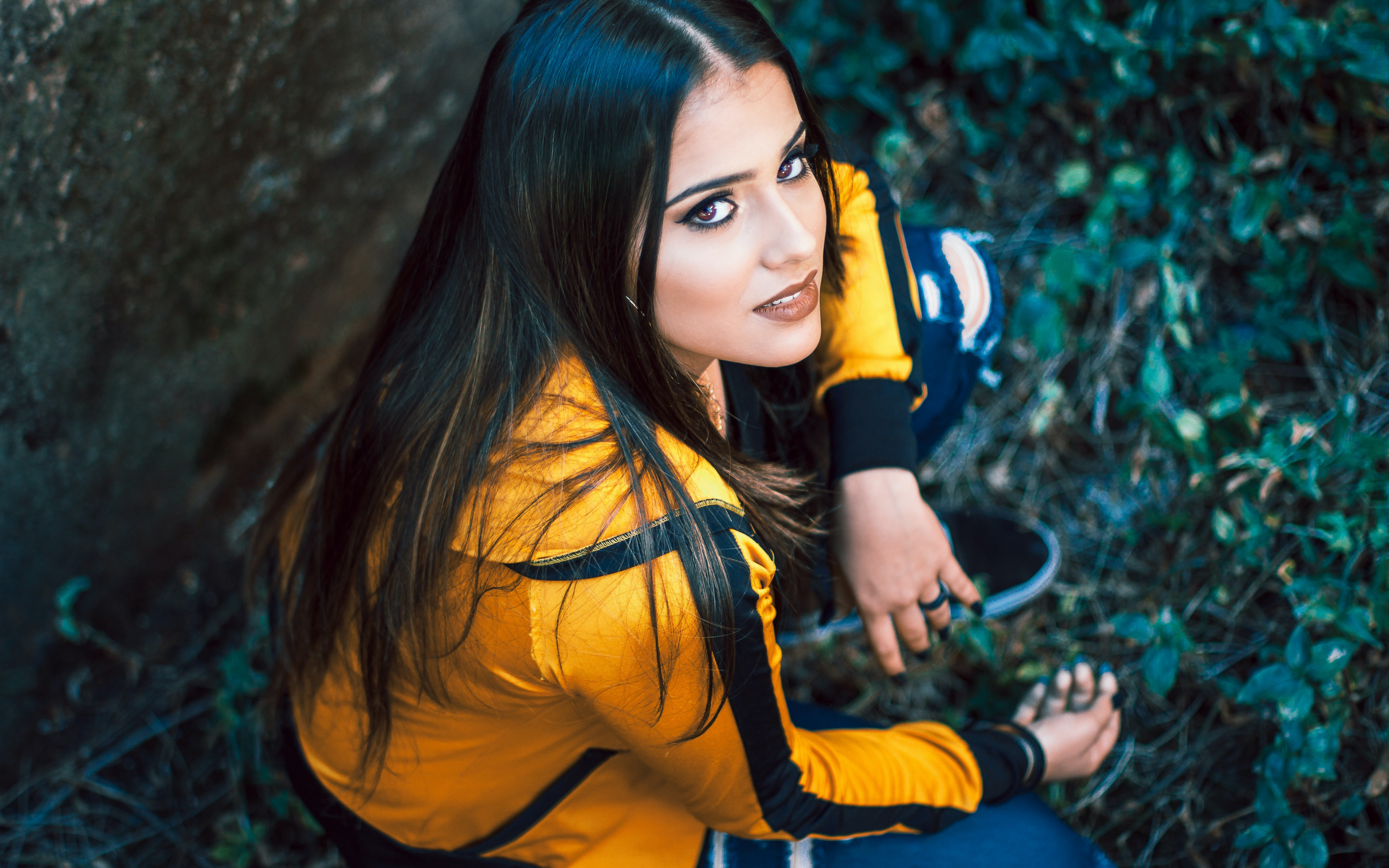 Description: A woman sitting on the ground with a backpack on her back and a backpack on her shoulder.