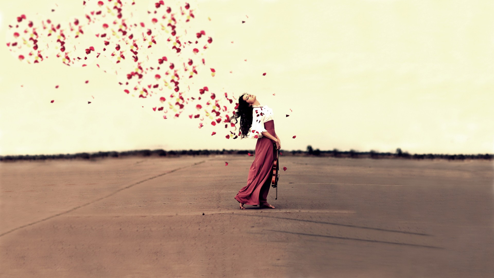 Description: A woman in a long dress is standing in a field with balloons in the air above her head and a bicycle in the foreground.