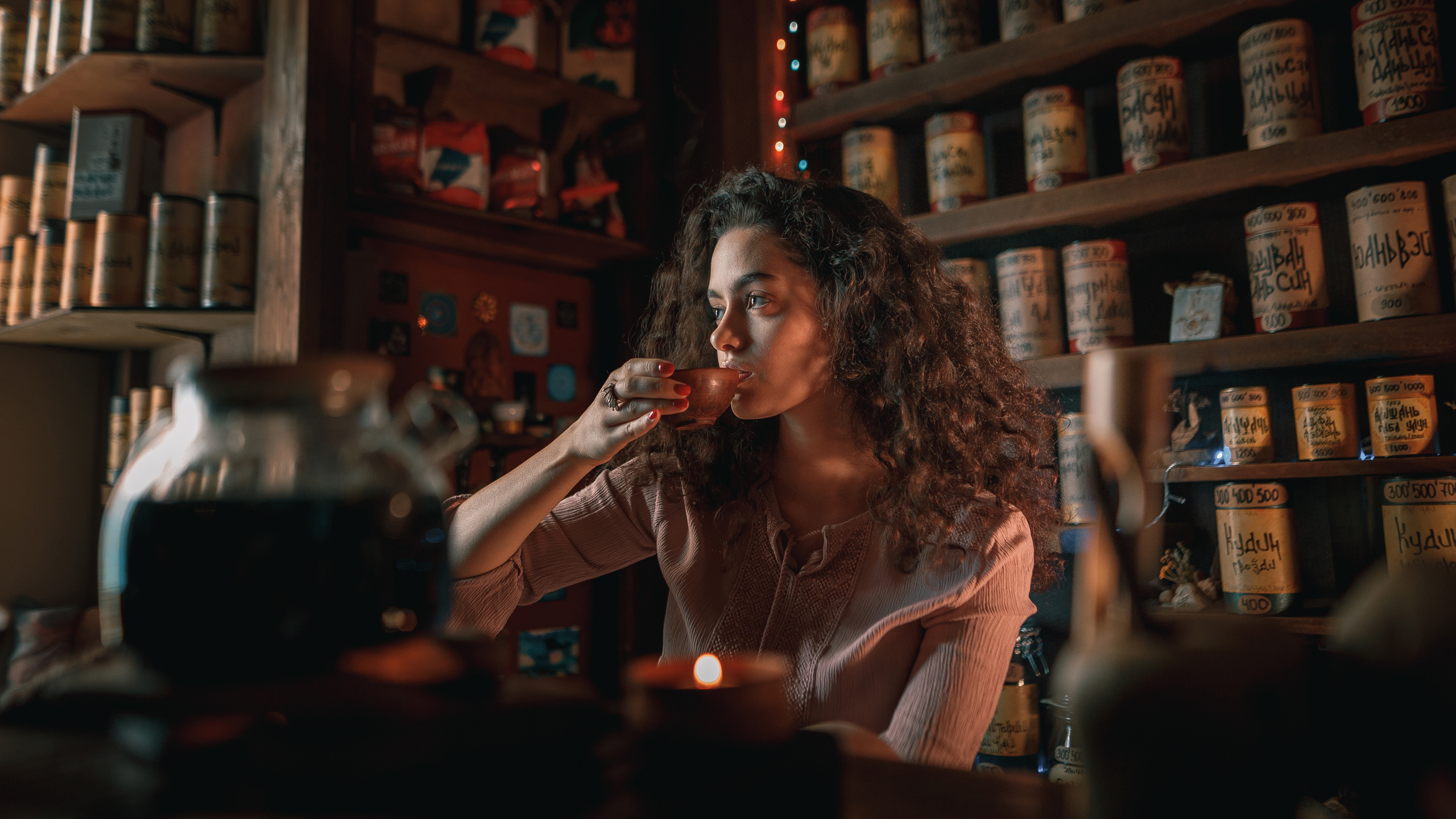 Description: A woman sitting at a bar with a glass of wine in her hand and a shelf full of jars behind her.