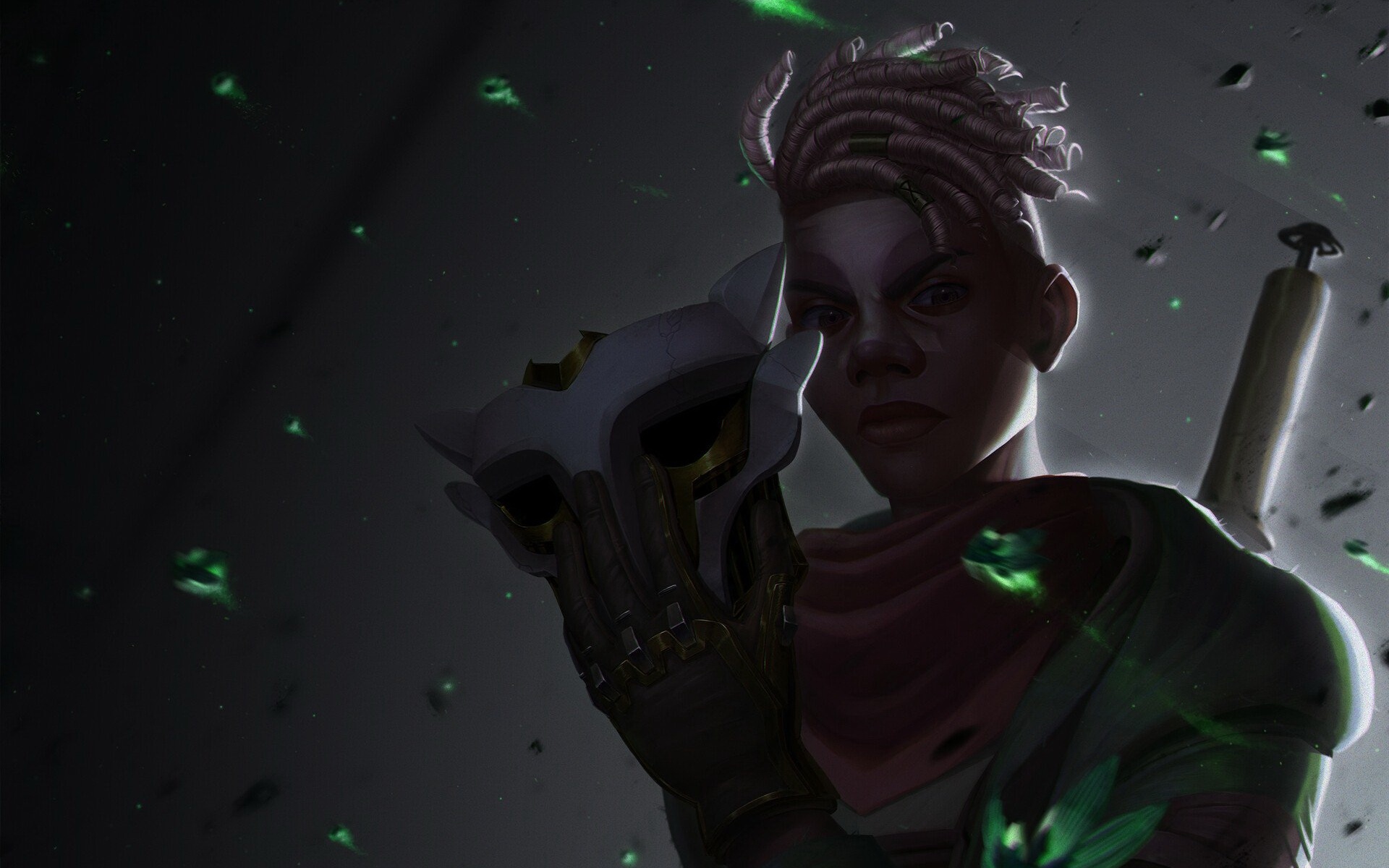 Description: A woman holding a baseball bat in her hand and a green light shining on her face and arm behind her.