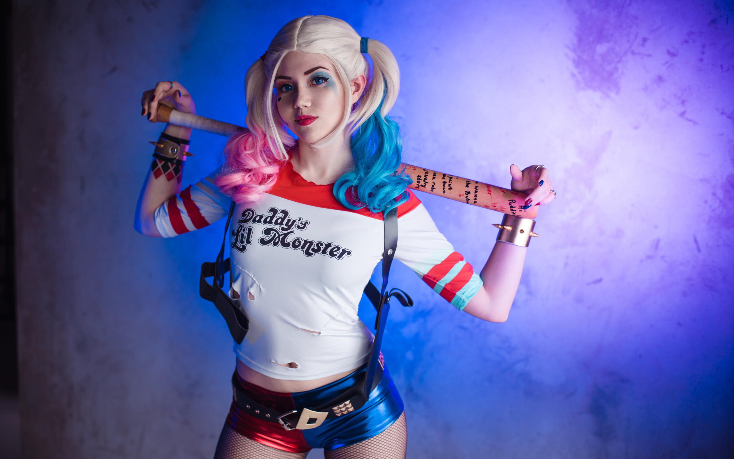 Description: A woman with a baseball bat and a shirt on and a tight belt around her waist and a measuring tape around her waist.