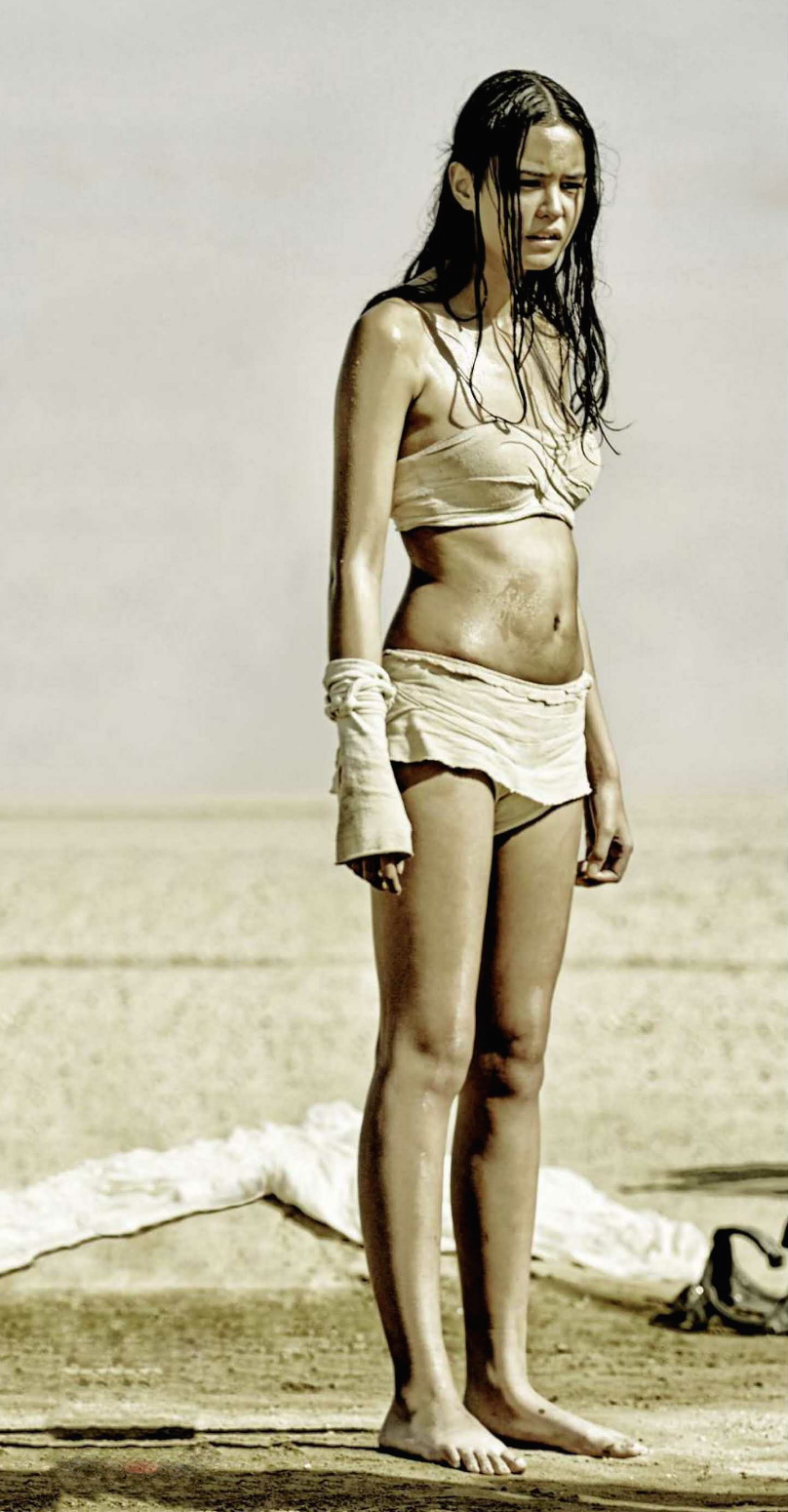 Description: A woman in a bathing suit standing on a beach with a frisbee in her hand and a towel on her shoulder.