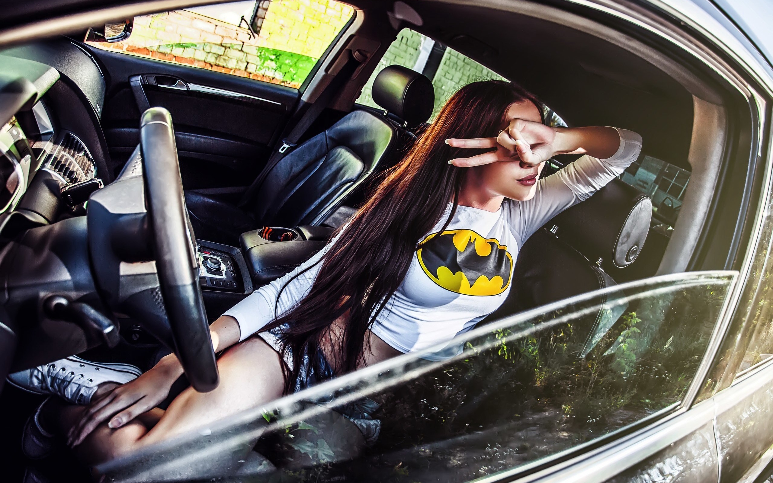 Description: A woman sitting in a car with a batman shirt on and a batman symbol on her shirt on her shirt.