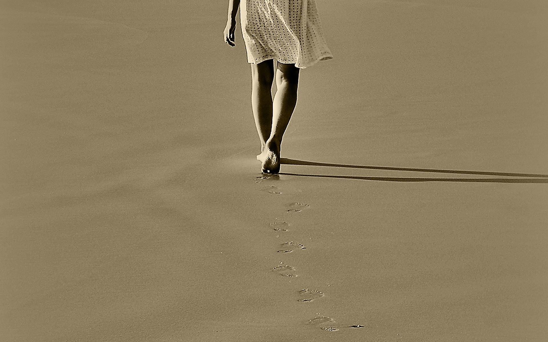 Description: A woman walking on a beach with a hat on her head and a long dress on her body and footprints in the sand.