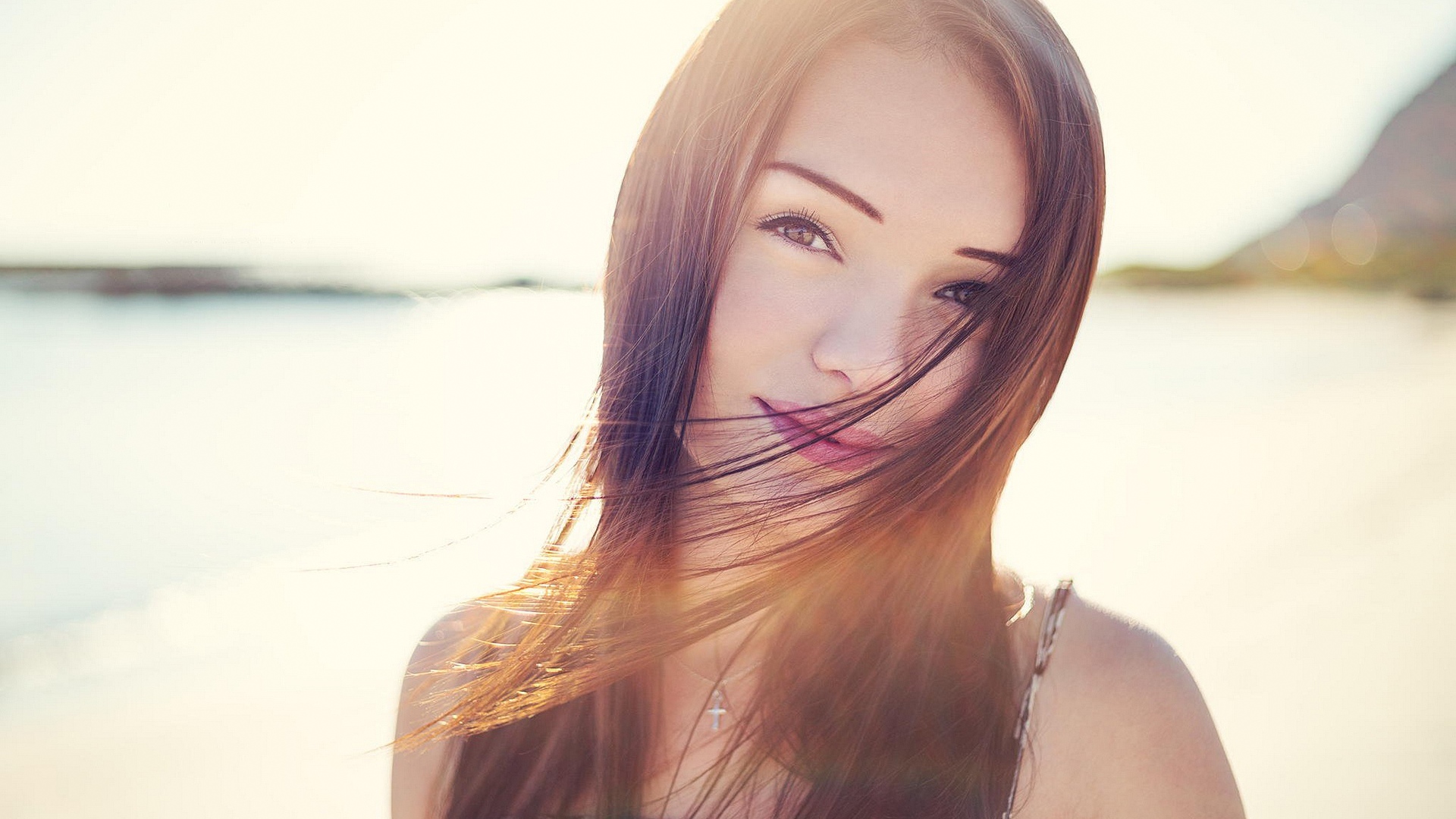 Description: A woman with long hair standing on a beach with the sun shining through her hair and looking at the camera.