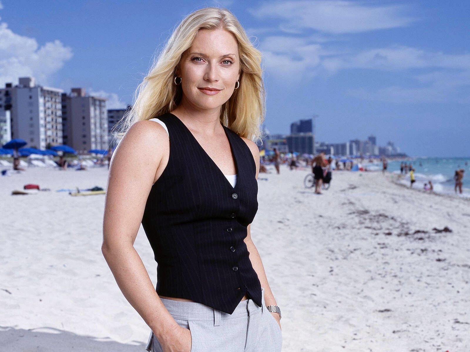 Description: A woman standing on a beach next to the ocean with a city in the background and a blue sky.