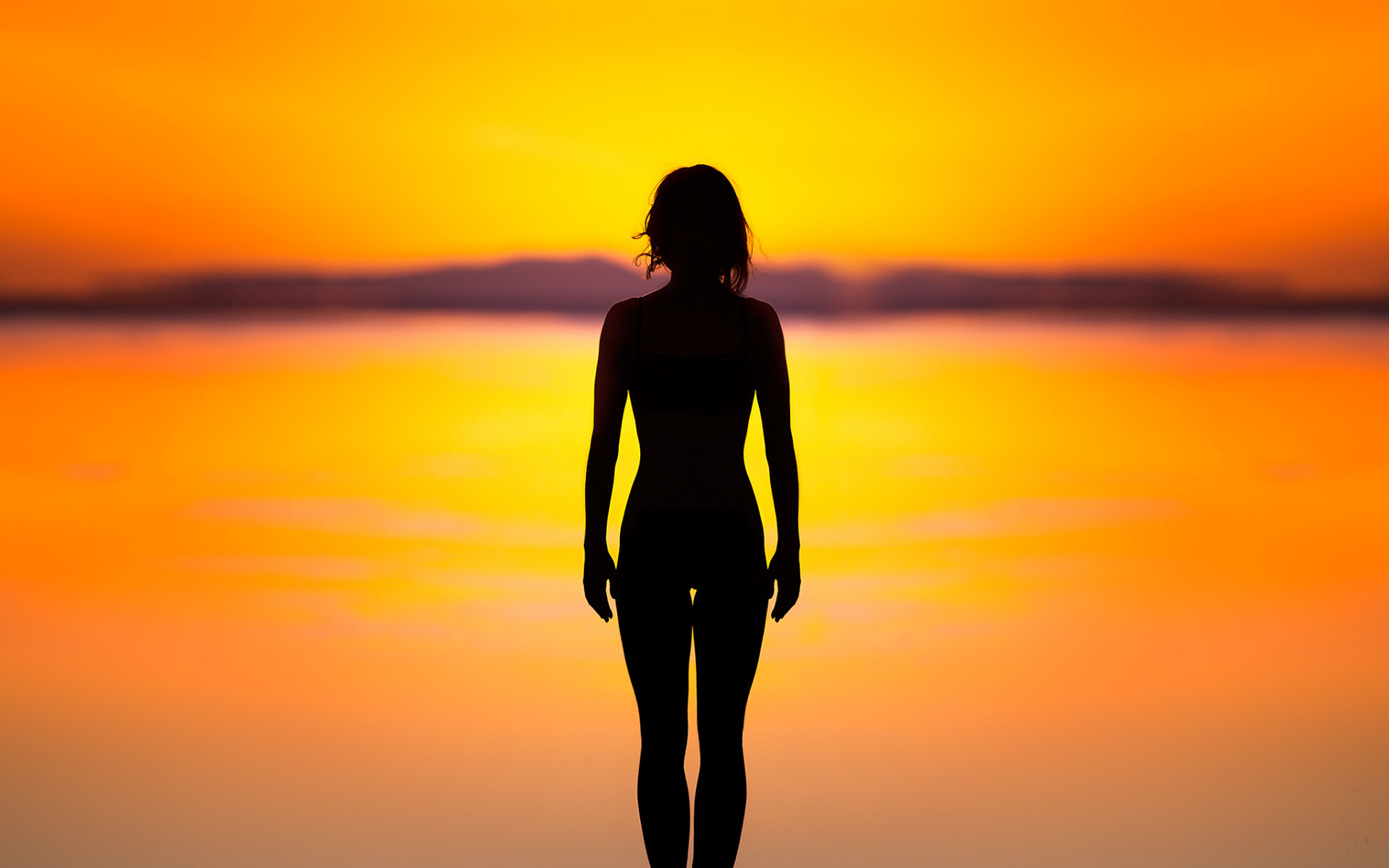 Description: A woman standing on a beach at sunset with her back to the camera and her arms behind her back.