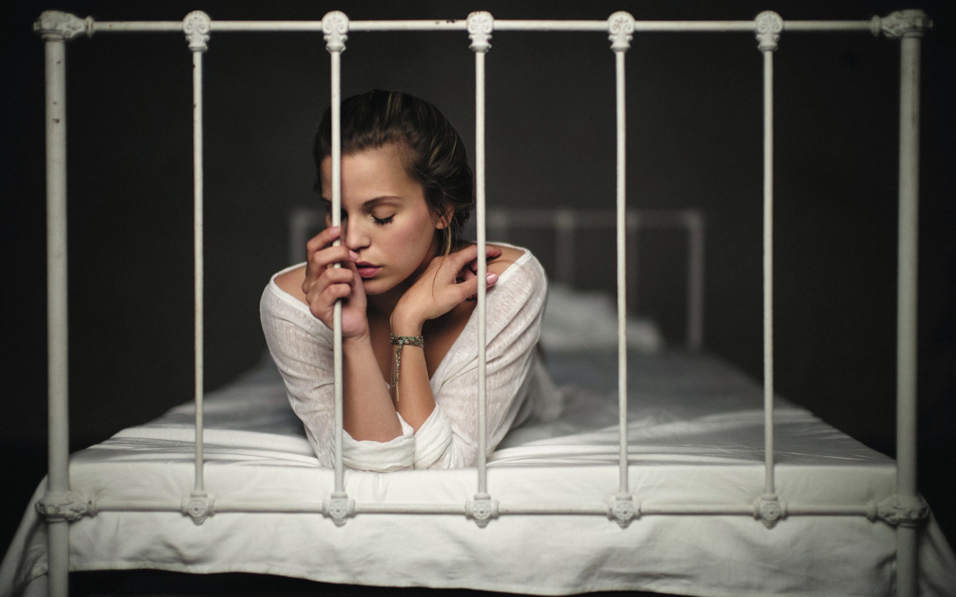 Description: A woman laying on a bed with a white blanket and a white iron bed frame with a white sheet.
