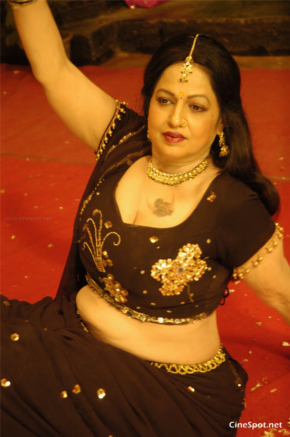 Description: A woman in a belly dance outfit with a rose in her hand and a red rose in her other hand.