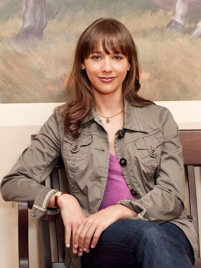 Description: A woman sitting on a bench in front of a painting of a deer and a woman with a purple shirt.