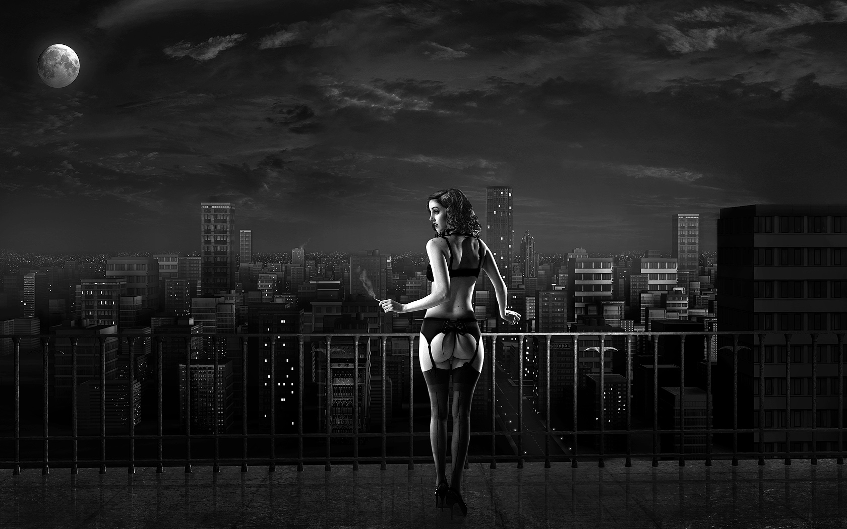 Description: A woman in a bikini standing on a balcony overlooking a city at night with a full moon in the sky.