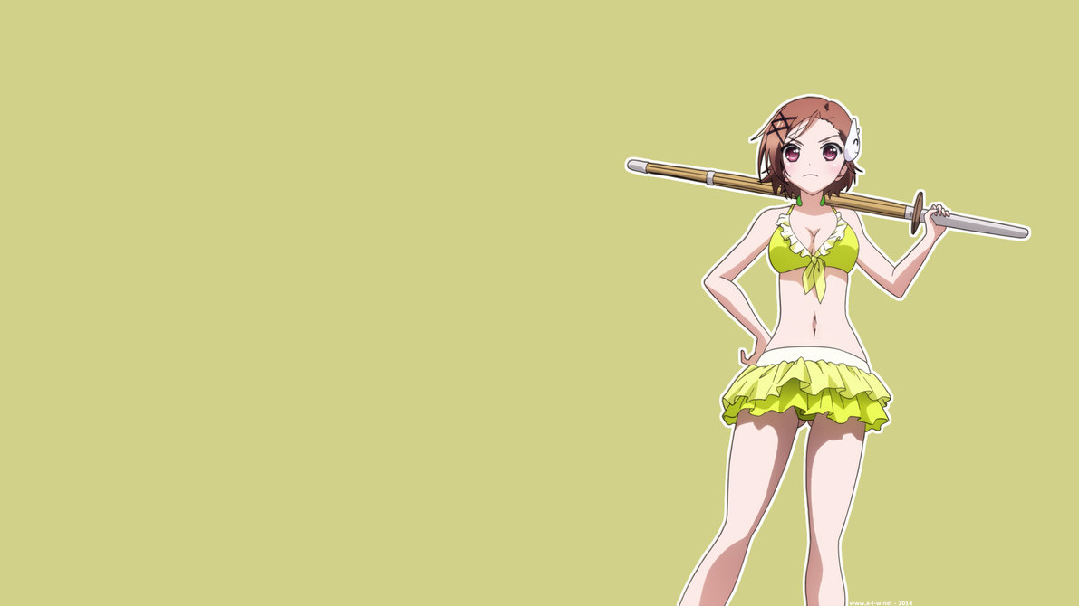 Description: A woman in a bikini holding a baseball bat on her shoulder and wearing a green skirt and yellow top.