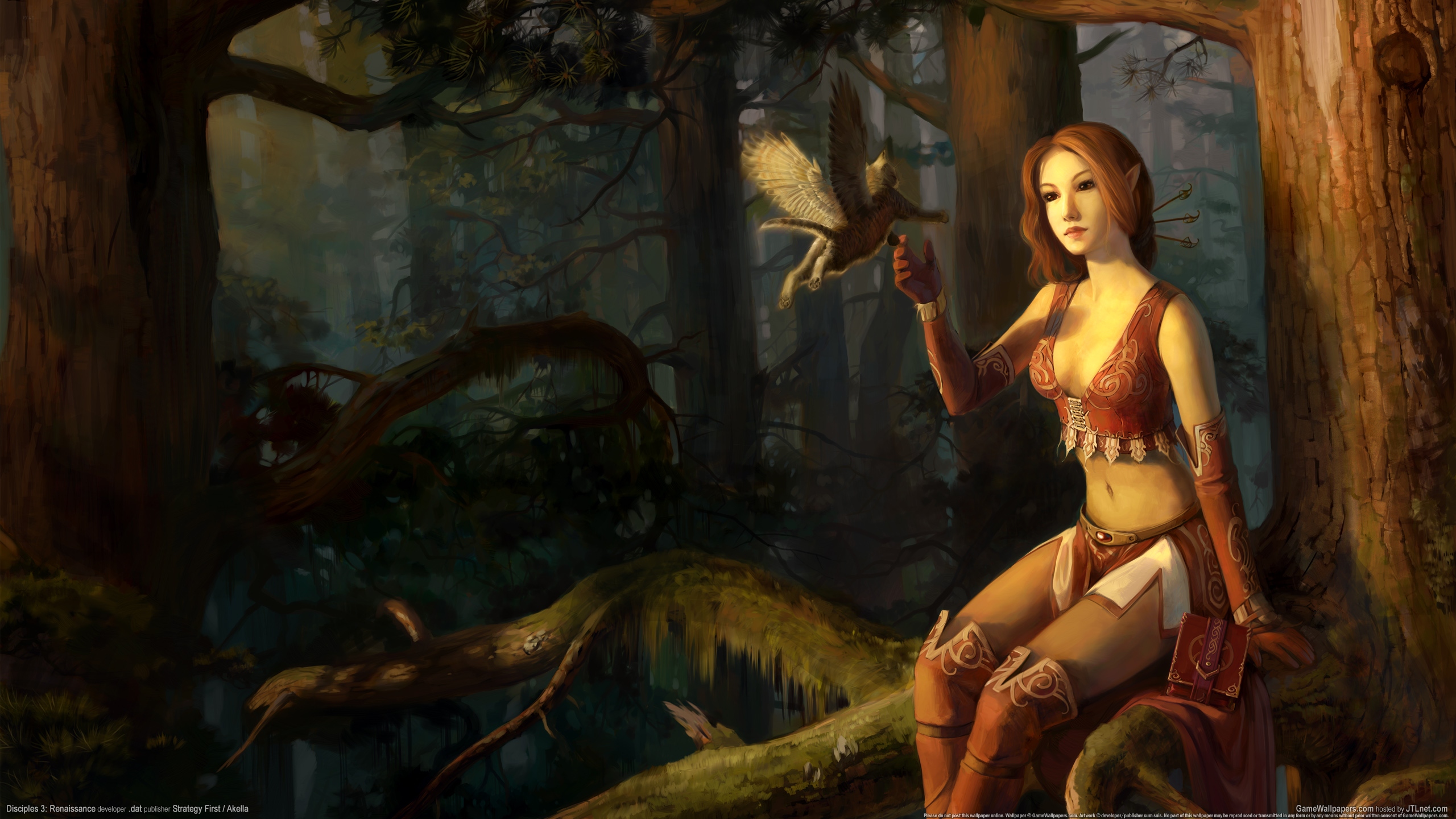 Description: A woman in a bikini holding a bird in a forest with trees and moss on the ground and a bird flying above her.