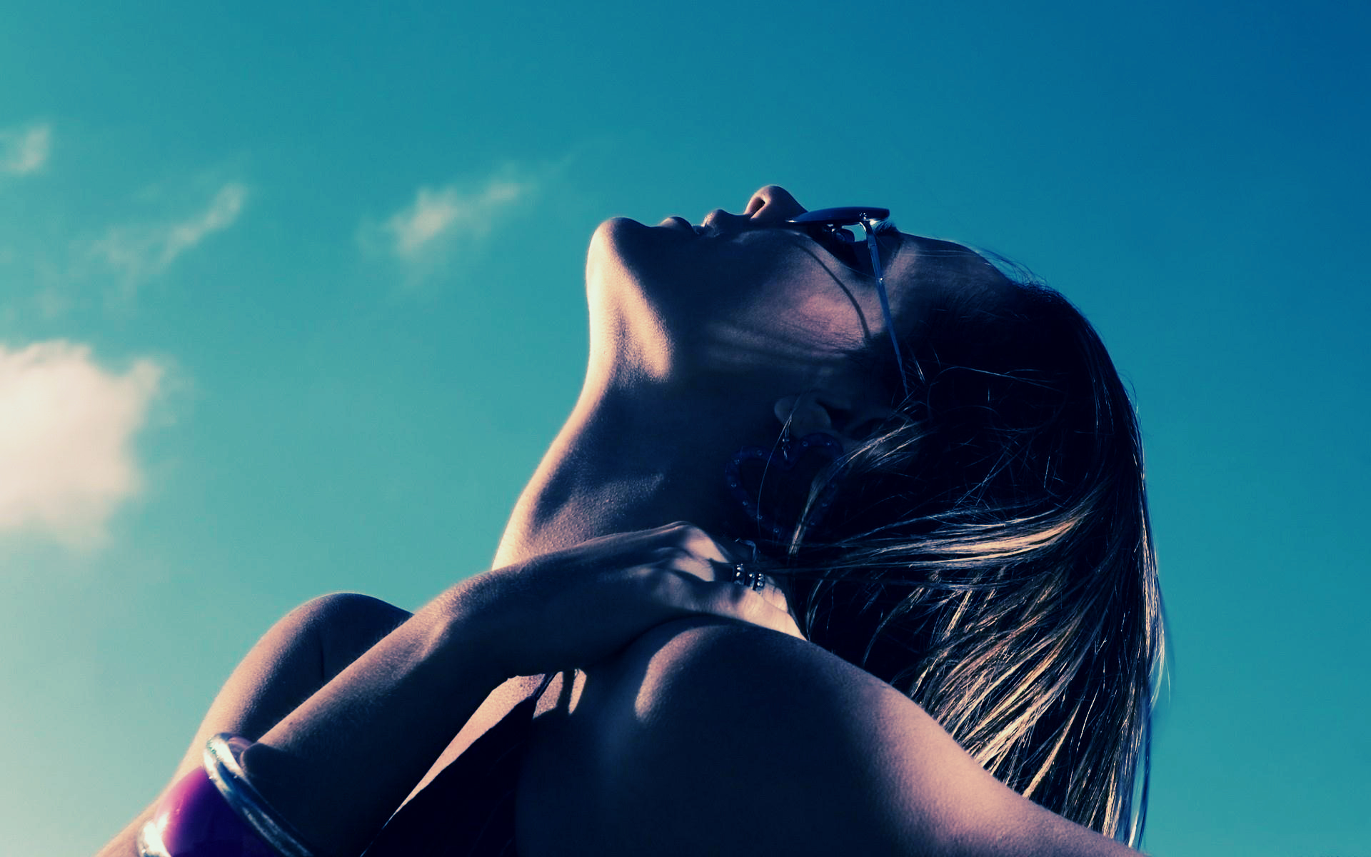 Description: A woman in a bikini is blowing her hair up in the air with her eyes closed and her head tilted back.