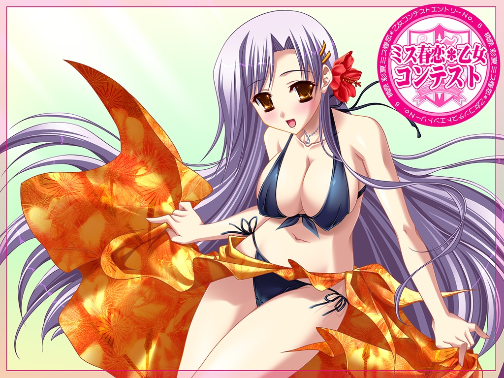 Description: A woman in a bikini with a fish tail around her neck and a flower in her hair.