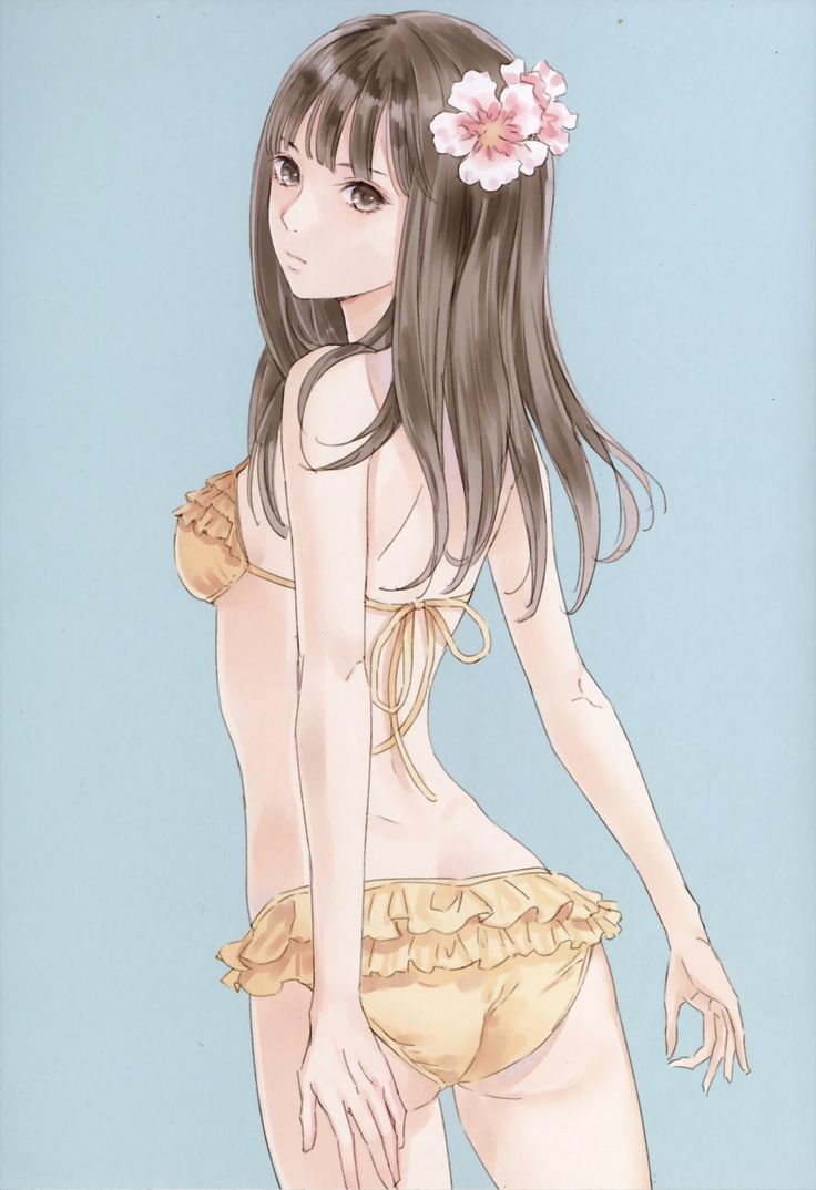 Description: A woman in a bikini with a flower in her hair and a flower in her hair.