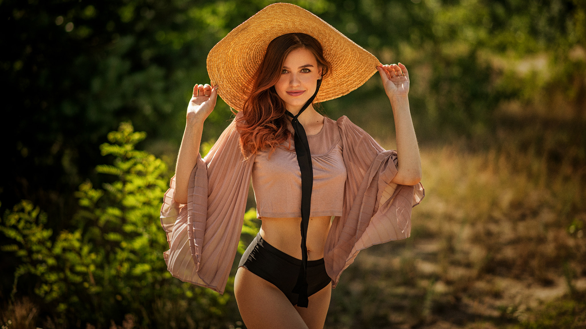 Description: A woman in a bikini and a straw hat poses for a picture in a wooded area with trees and bushes.