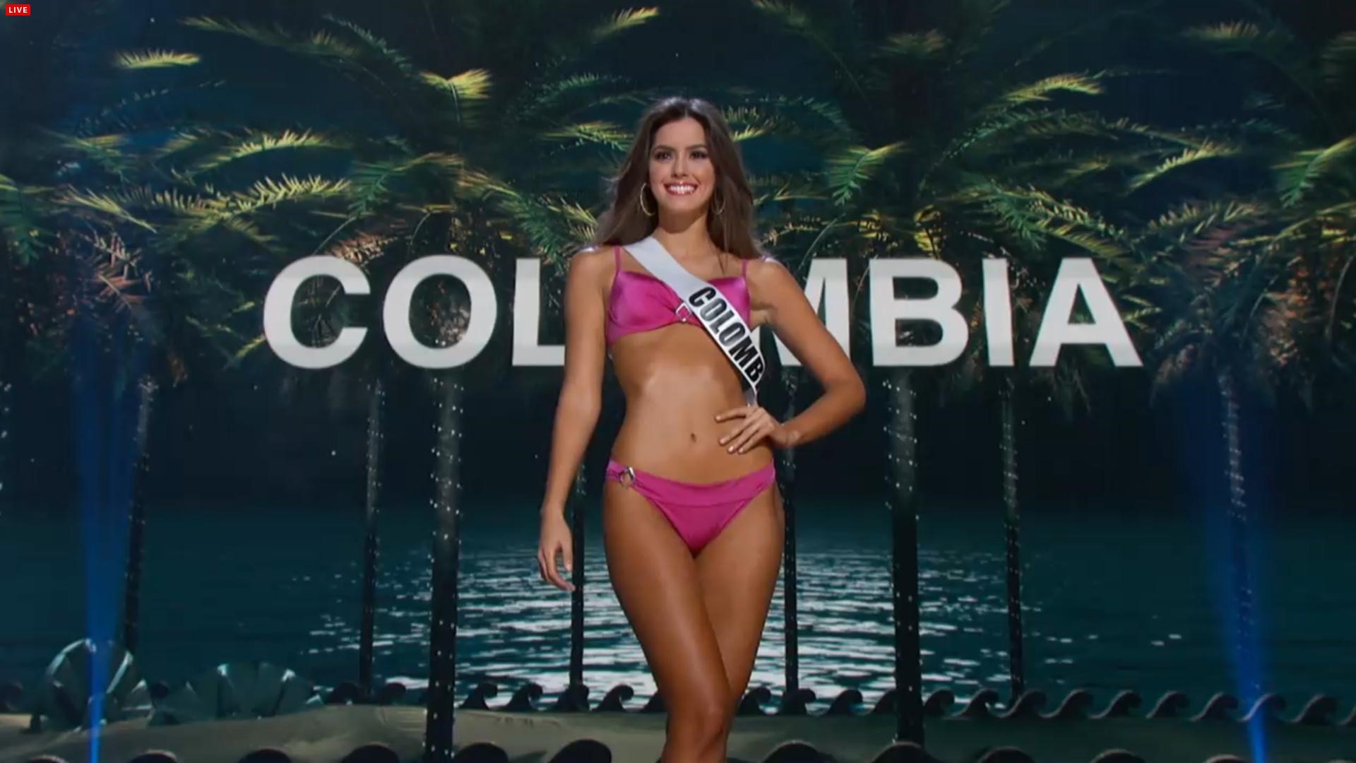 Description: A woman in a bikini posing for a picture in front of a backdrop of palm trees and water with a sign that says.