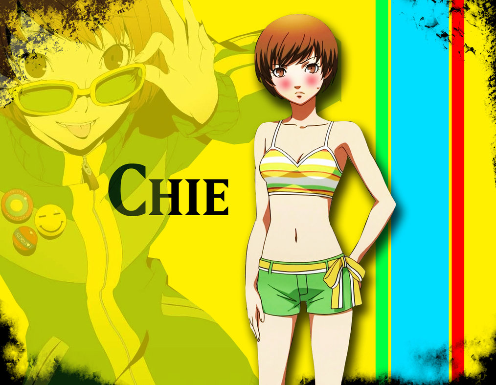 Description: A woman in a bikini top and shorts standing next to a rainbow colored background with a cartoon character in the background.