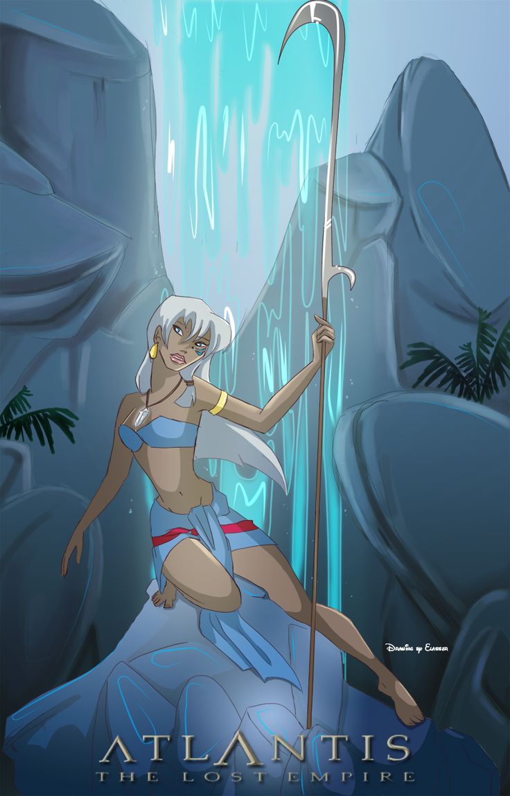 Description: A woman in a bikini holding a spear and standing in front of a waterfall with a waterfall behind her.