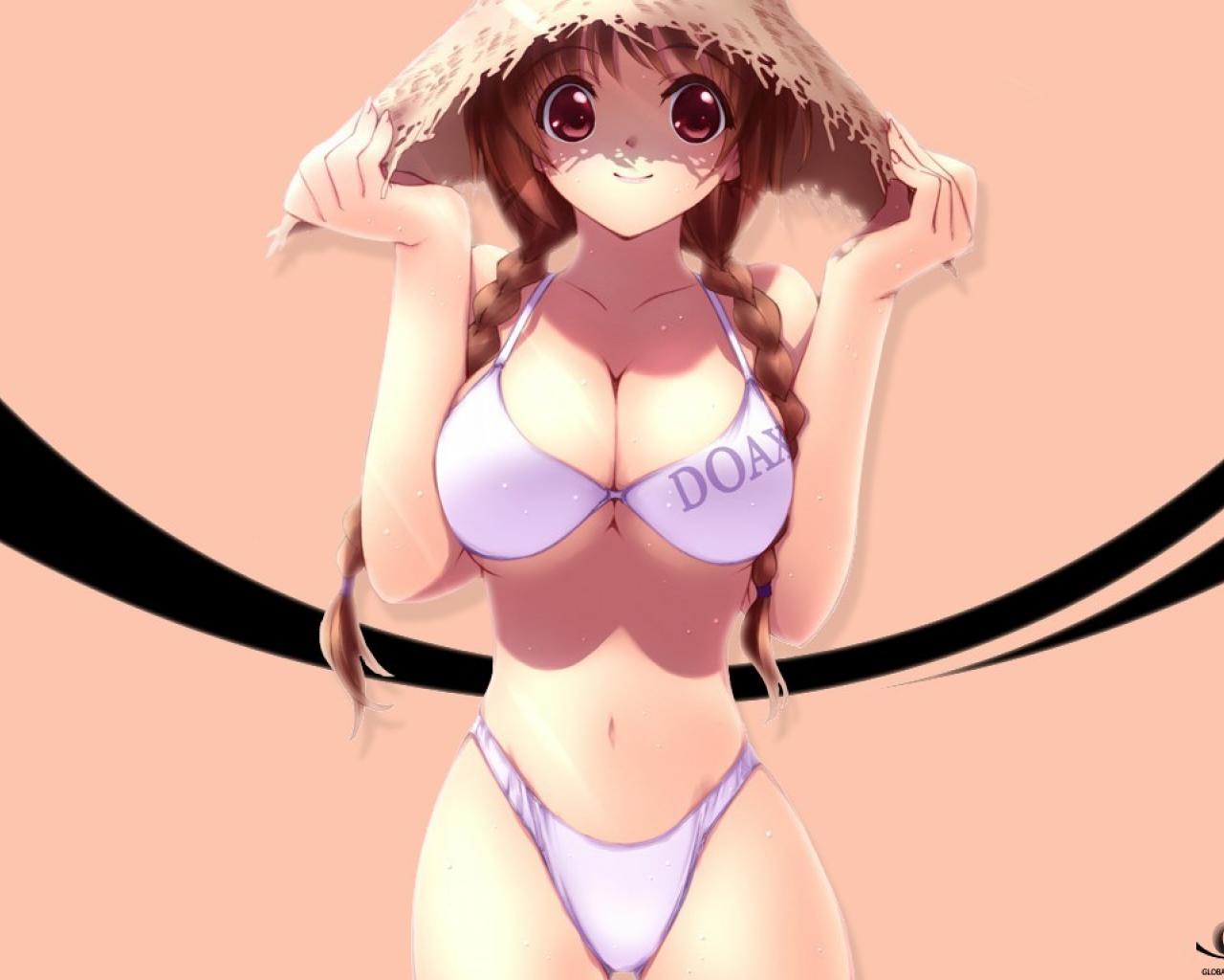 Description: A woman in a bikini and a straw hat on her head is standing in front of a pink background.