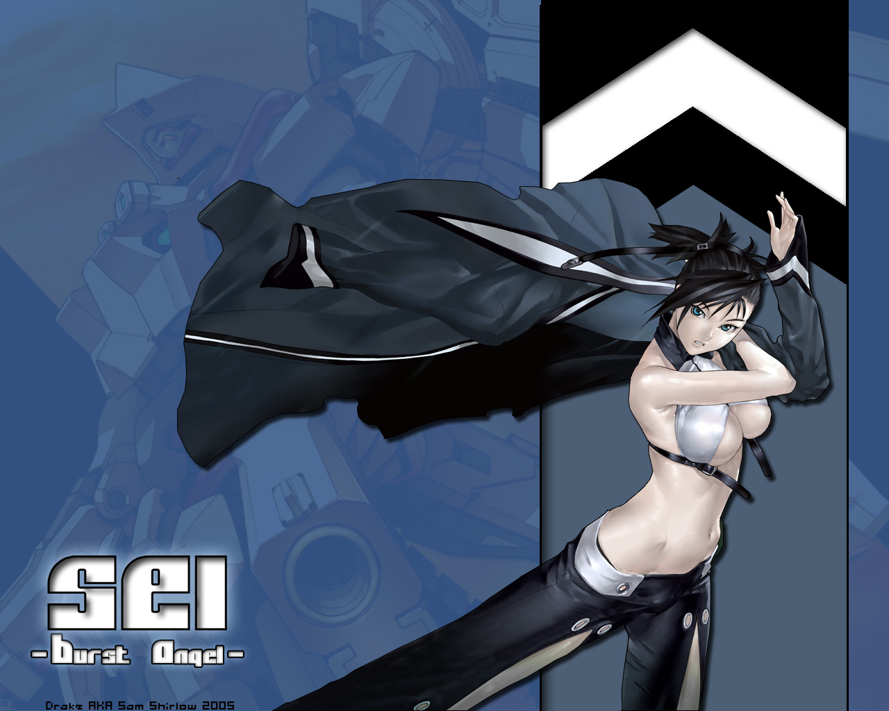 Description: A woman in a bikini and black pants with a sword in her hand and a black and white arrow in her hand.