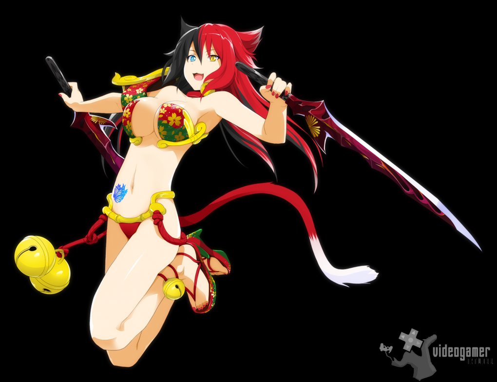 Description: A woman in a bikini holding a sword and a ball in her hand and a black background behind her.