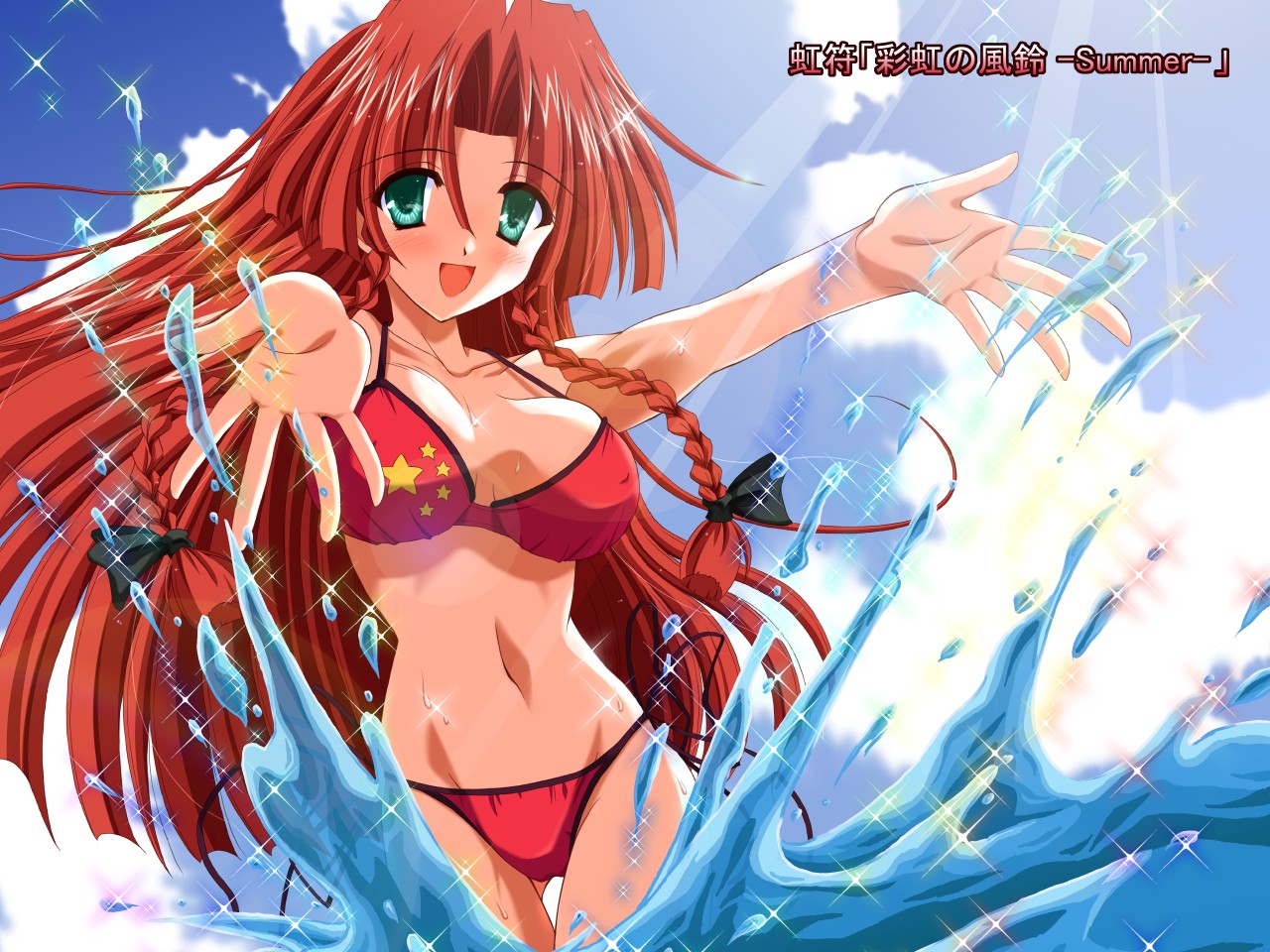 Description: A woman in a bikini standing in the water with her arms out and her hands out in the air.