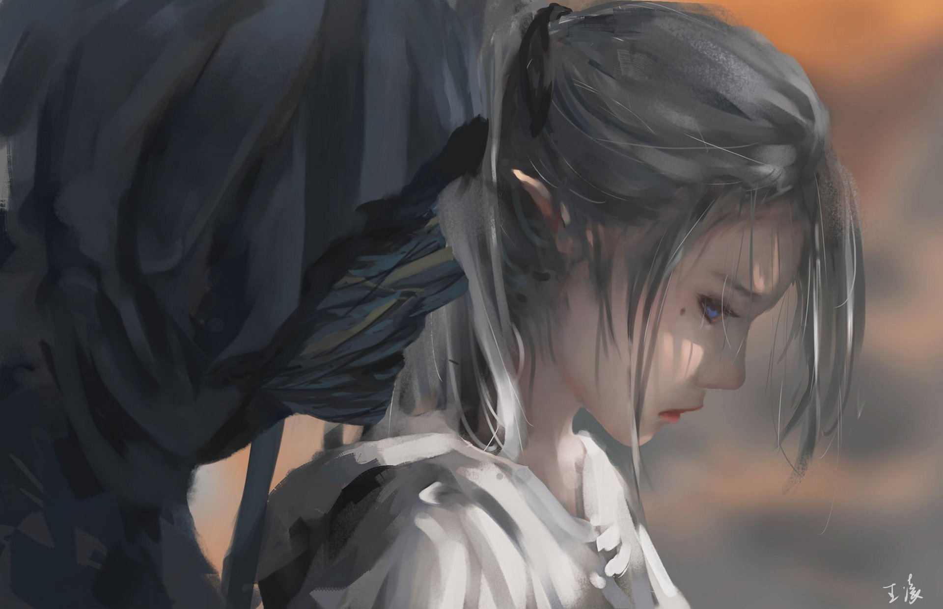 Description: A woman with a black bird on her shoulder and a white shirt on her shoulder.