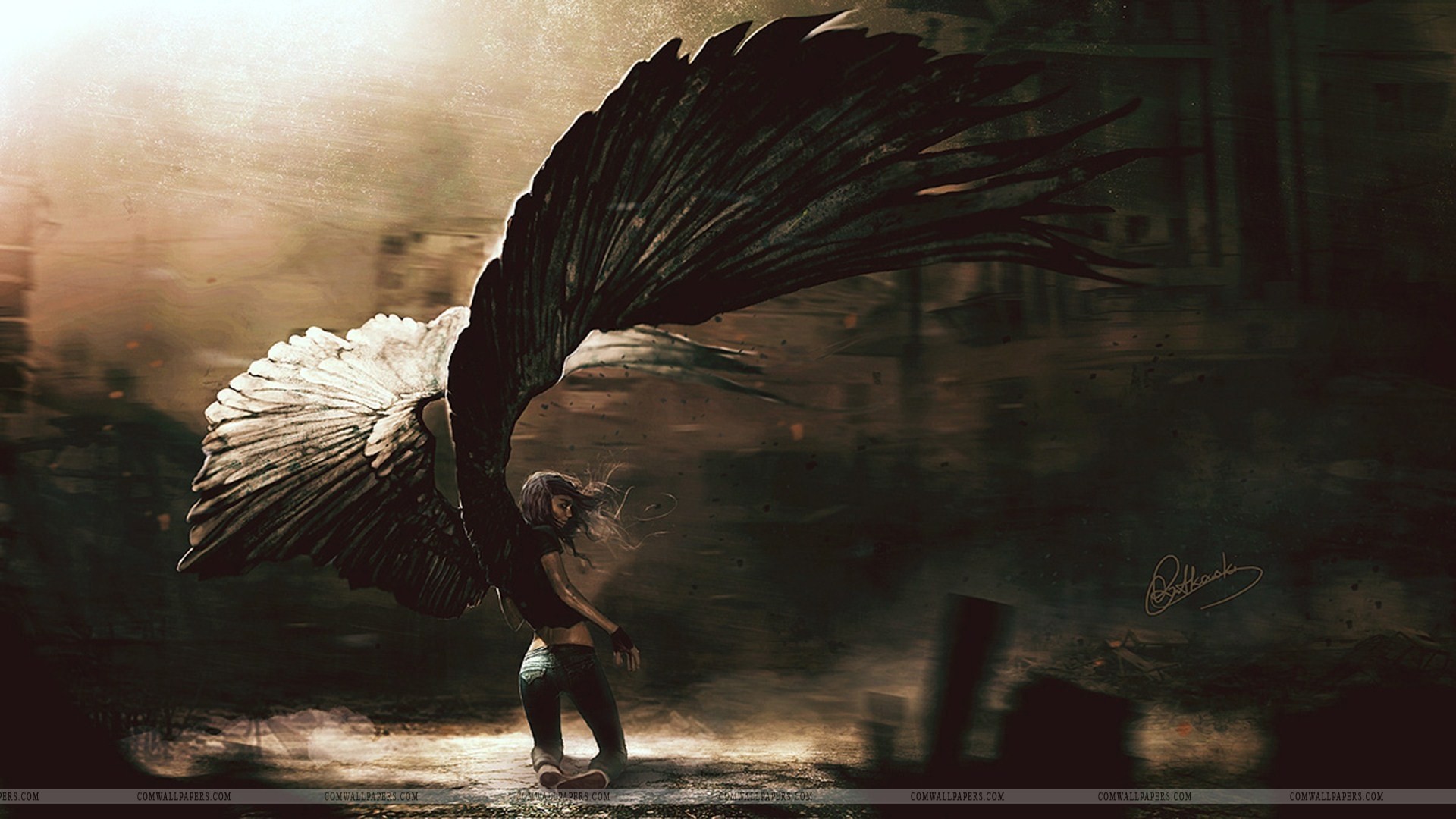 Description: A woman with a large black bird wings in her hand and a building in the background with a light shining through.