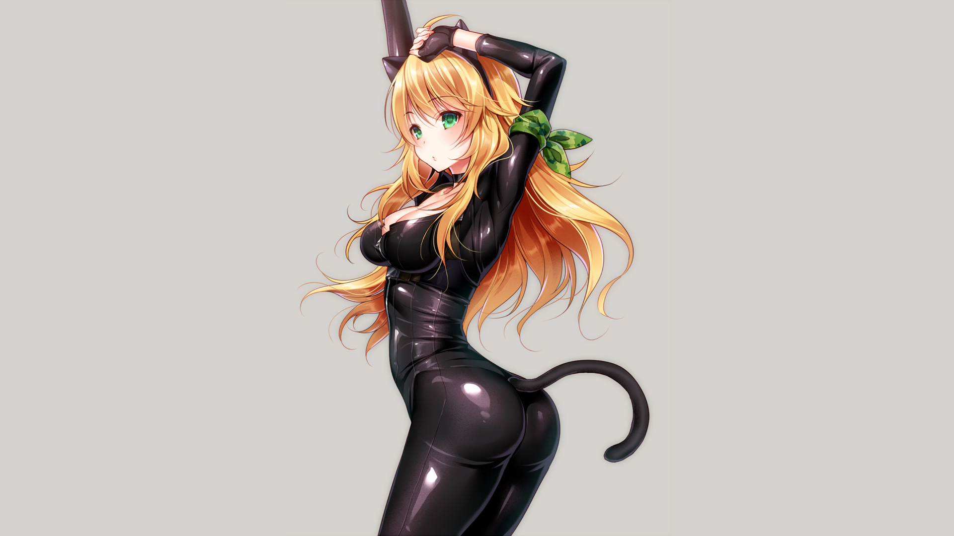 Description: A woman in a black catsuit holding a green apple in her hand and a cat tail in her other hand.