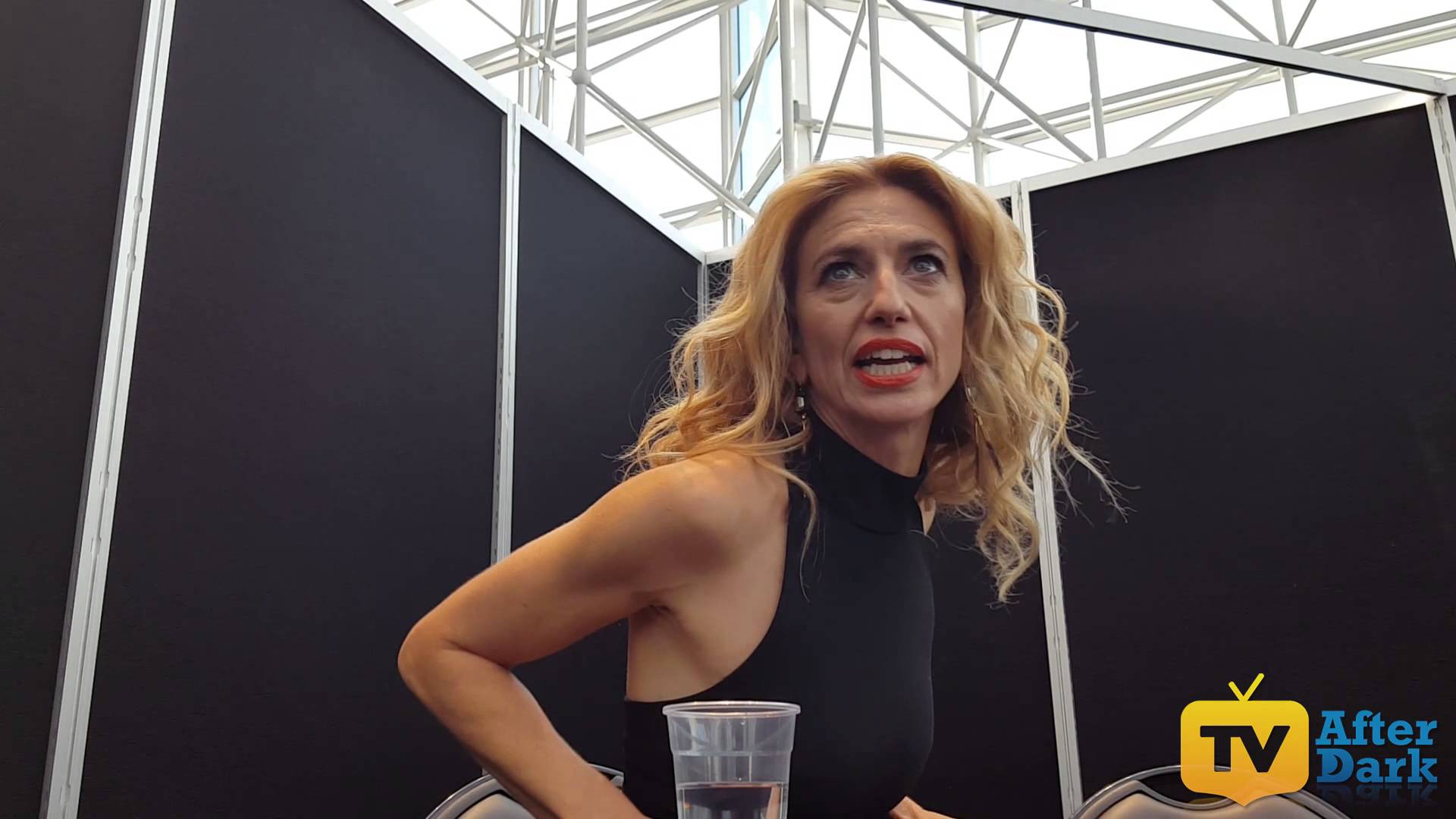 Description: A woman in a black dress standing in front of a black wall with a glass of water in front of her.