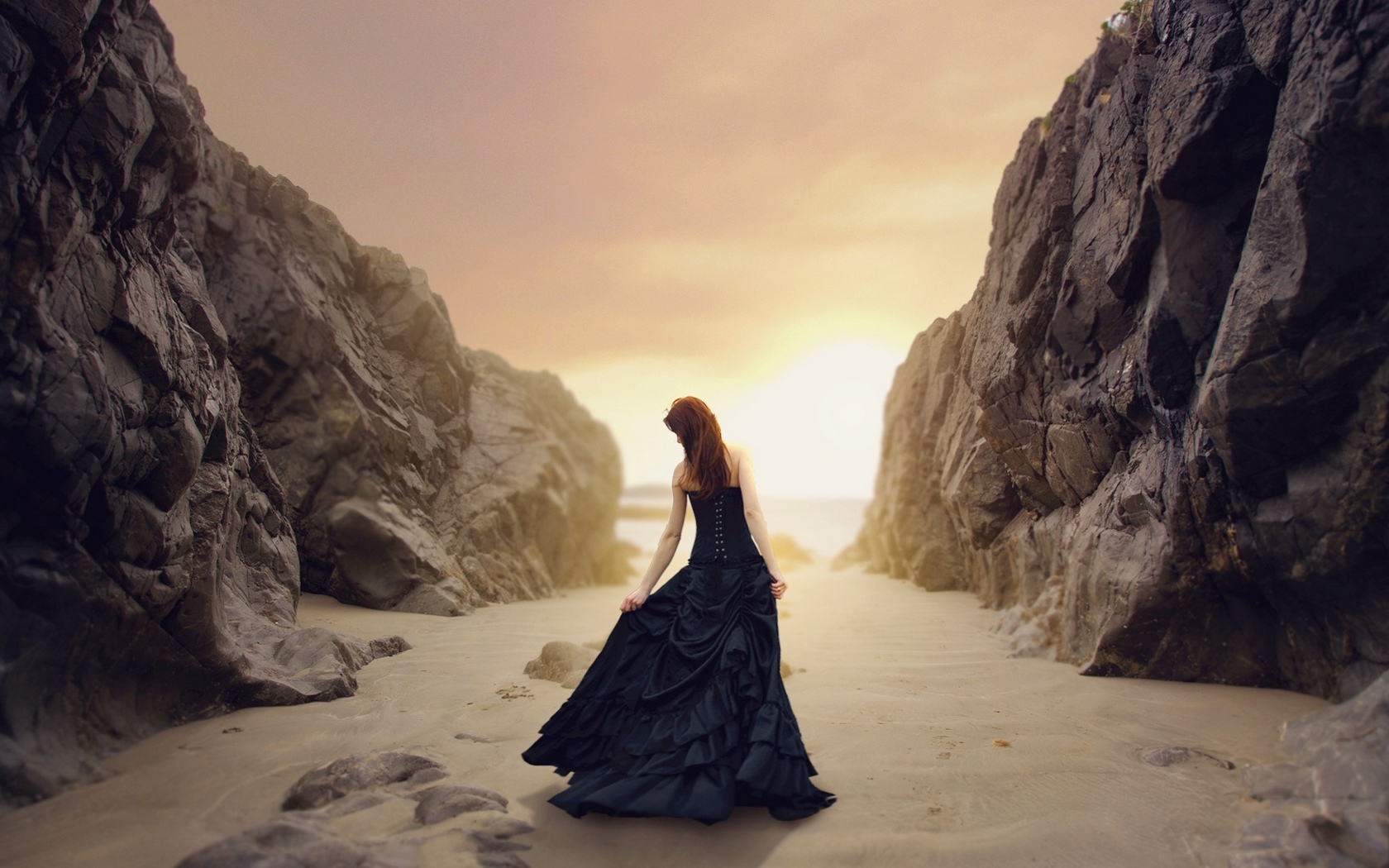 Description: A woman in a black dress standing in a cave on a beach with rocks and water in the background.
