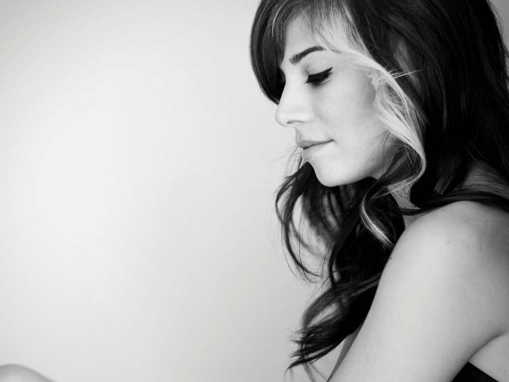 Description: A woman in a black dress is holding a cell phone in her hand and looking down at her wrist.