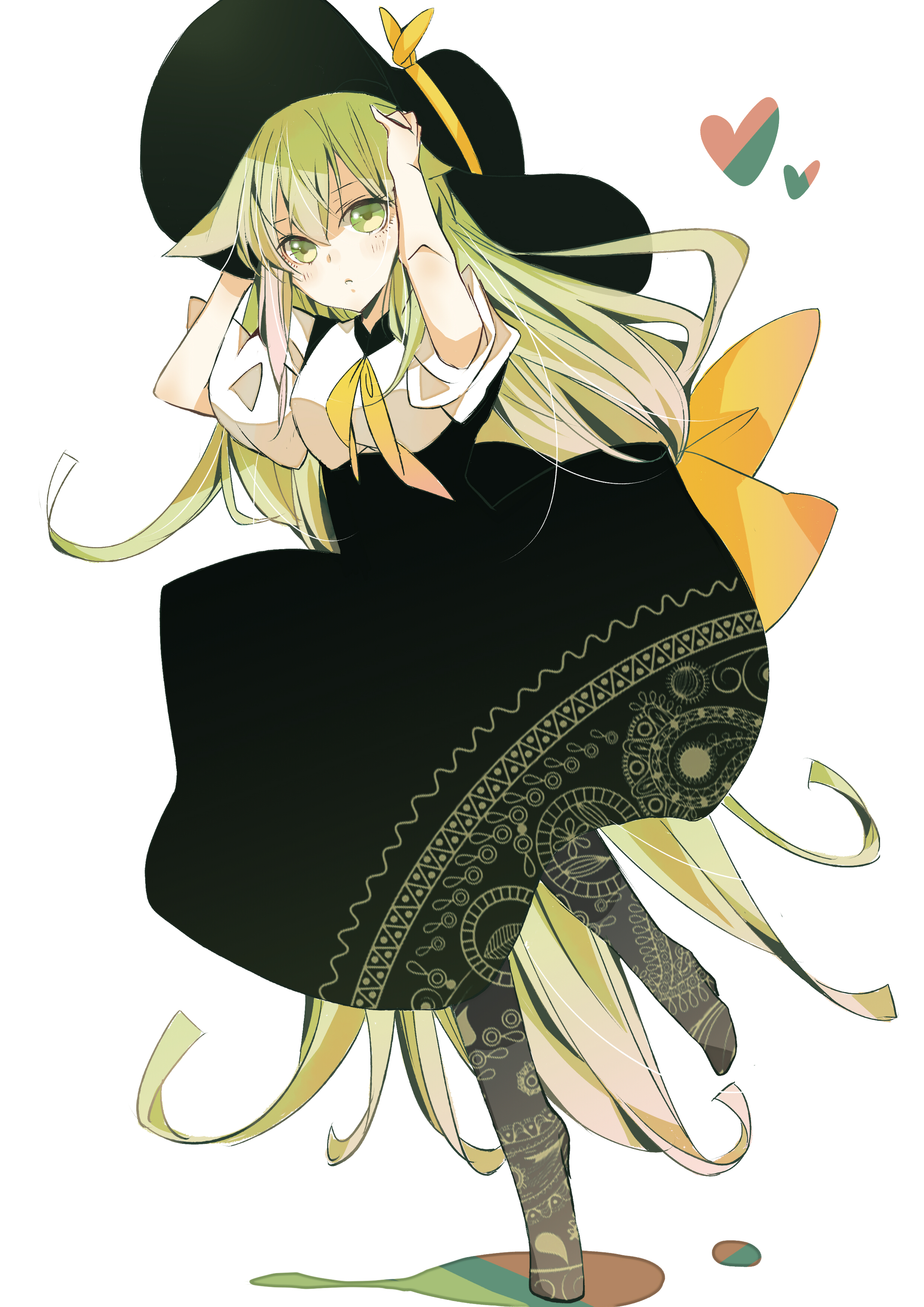 Description: A woman in a black dress and hat with long blonde hair and a black hat on her head.