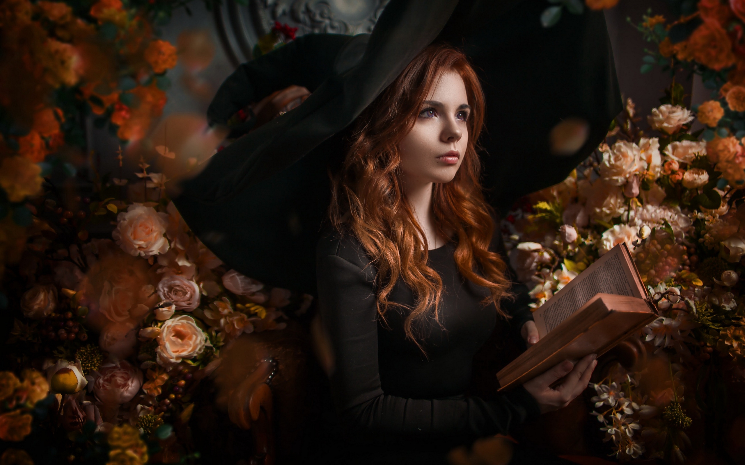 Description: A woman in a black dress holding a book in front of a flowery background with a large black hat.