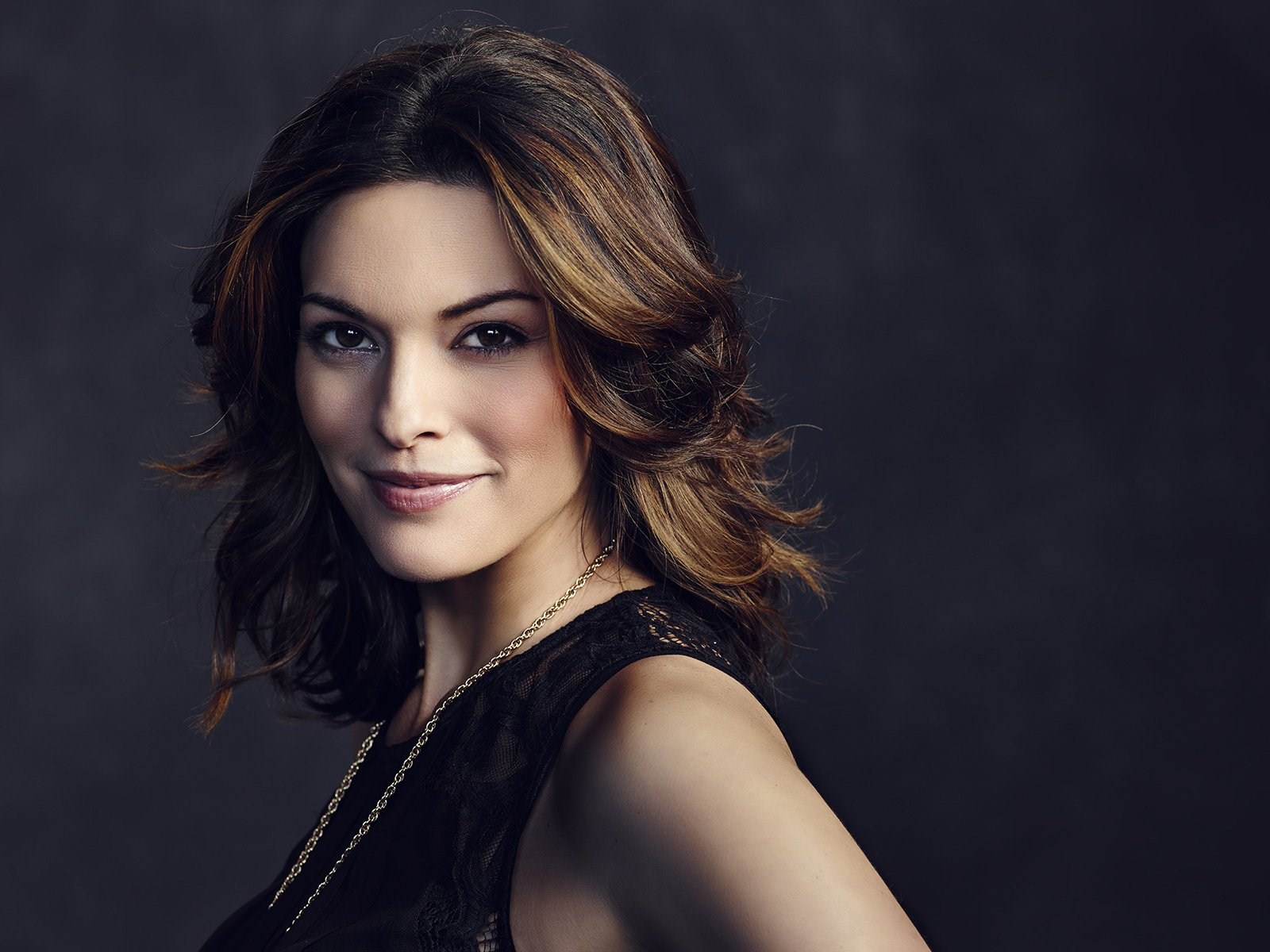 Description: A woman with a black dress and a necklace on her neck posing for a picture with a black background.