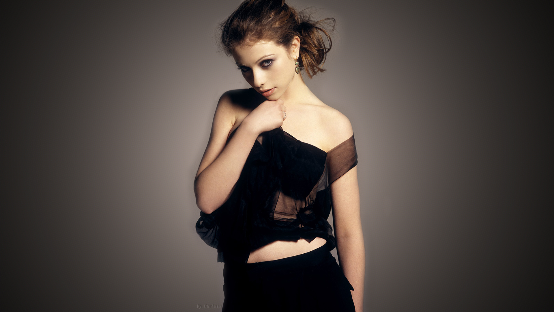 Description: A woman in a black dress posing for a picture with her hands on her hips and her hair in a bun.