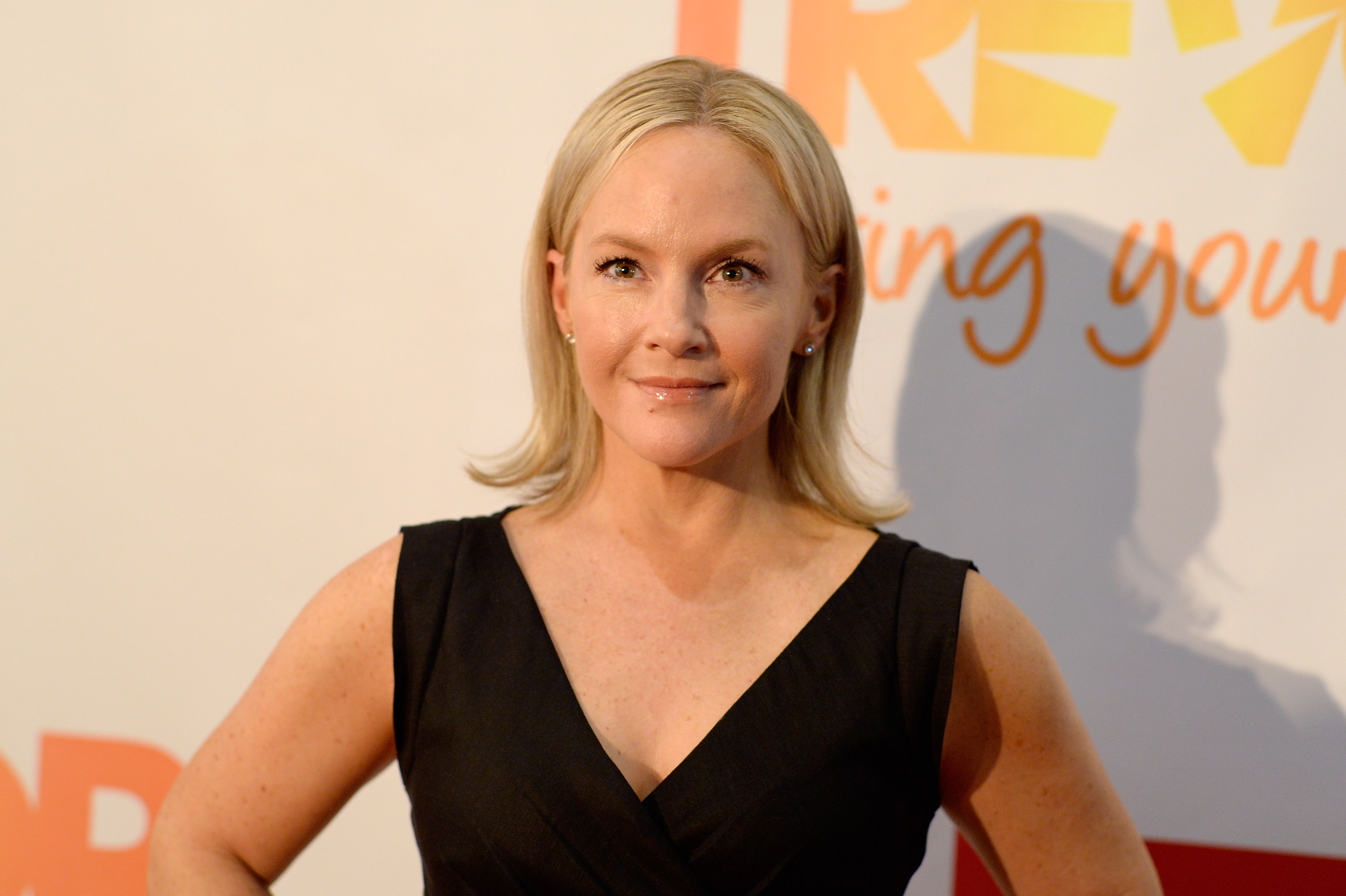 Description: A woman in a black dress posing for a picture on a red carpet with a white background and a bright orange and yellow sign.